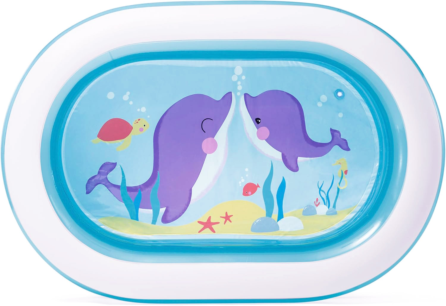- Dno z barwnym motywem – przedstawia morską scenerię z delfinami, rybką, żółwiem i bąbelkami, co natychmiast przyciąga uwagę dziecka. Taka grafika pobudza wyobraźnię i kreatywność, zachęcając malucha do wymyślania zabaw w wodnym świecie. Kolorowe ilustracje sprawiają, że każda kąpiel staje się niezapomnianą przygodą.