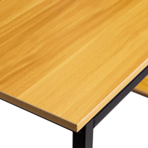 - Blat biurka pokryty jest okleiną w jasno dębowym kolorze, a jego duża powierzchnia pozwala na swobodną pracę biurową.