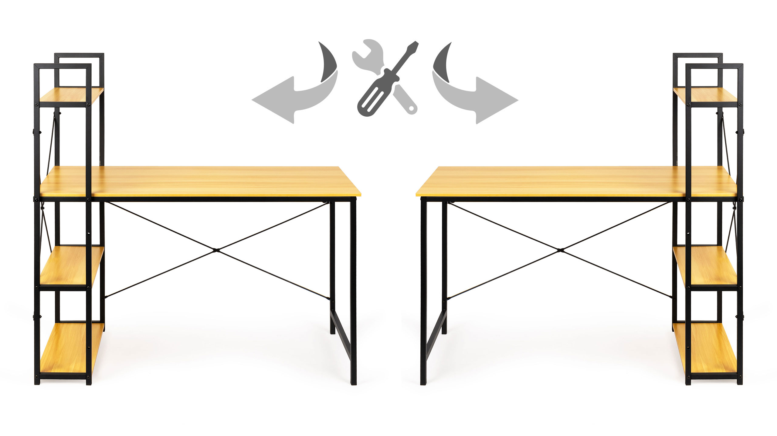 - Możliwość złożenia biurka z półkami po lewej lub prawej stronie