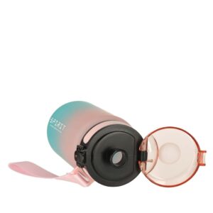 Różowo-niebieski bidon ze smyczą i miarką o pojemności 600 ml. Ma ustnik i zamykaną klapkę typu „klik” która nie rozchlapuje wody. Parametry na butelce pokazują ile wody wypiliśmy w ciągu dnia. Wymiary: 19 cm x 9 cm