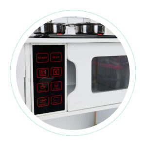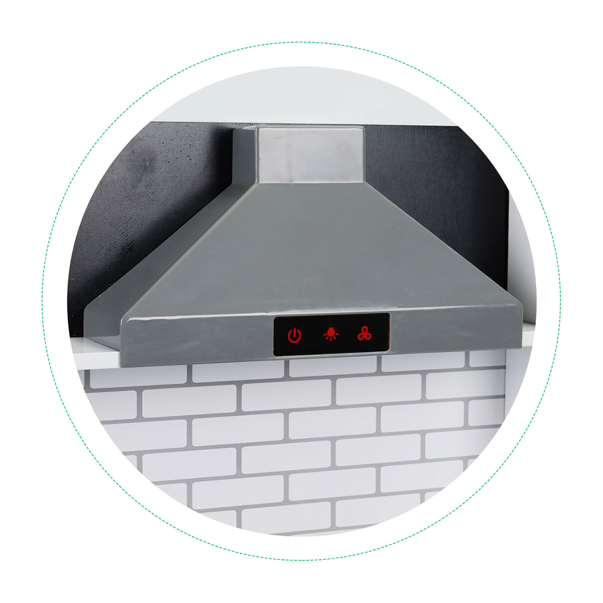 Do dyspozycji szefa kuchni są min. podświetlane palniki, które dodatkowo wydają dźwięk gotowanej wody. Pod blatem znajduje się piekarnik, mikrofala i duża szafka. W górnej części zamontowany jest wentylator oraz haczyki na przybory.