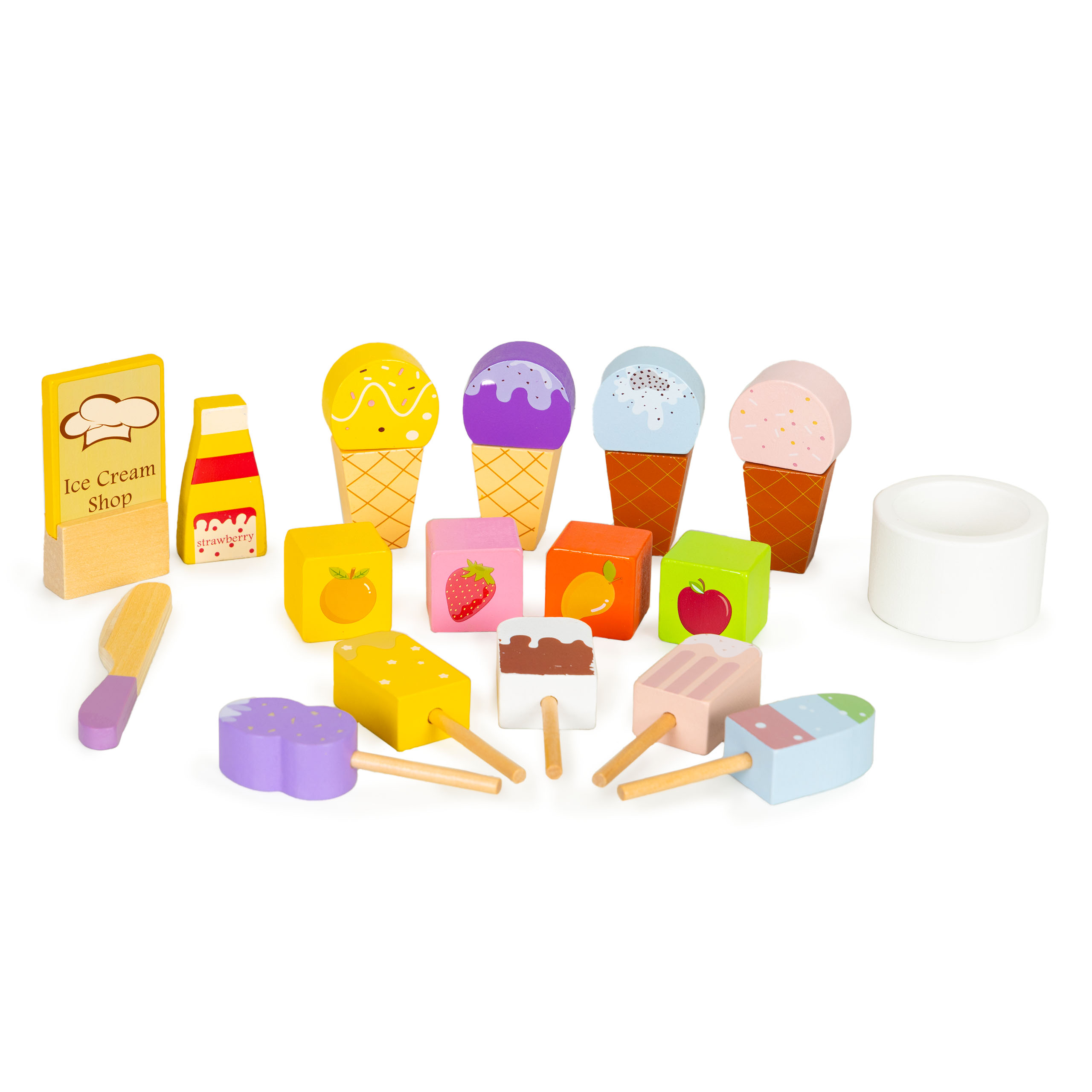 Drewniane elementy dołączone do zestawu są starannie wykonane i pozbawione ostrych krawędzi. Każdy z nich posiada inną formę oraz kolorową grafikę dzięki temu można stworzyć wiele bajecznych lodów. Dodatkowo, Twój maluch będzie miał wielką frajdę z samego tworzenia różnych scenariuszy podczas odgrywania roli sprzedawcy lub klienta.