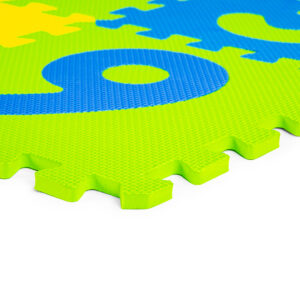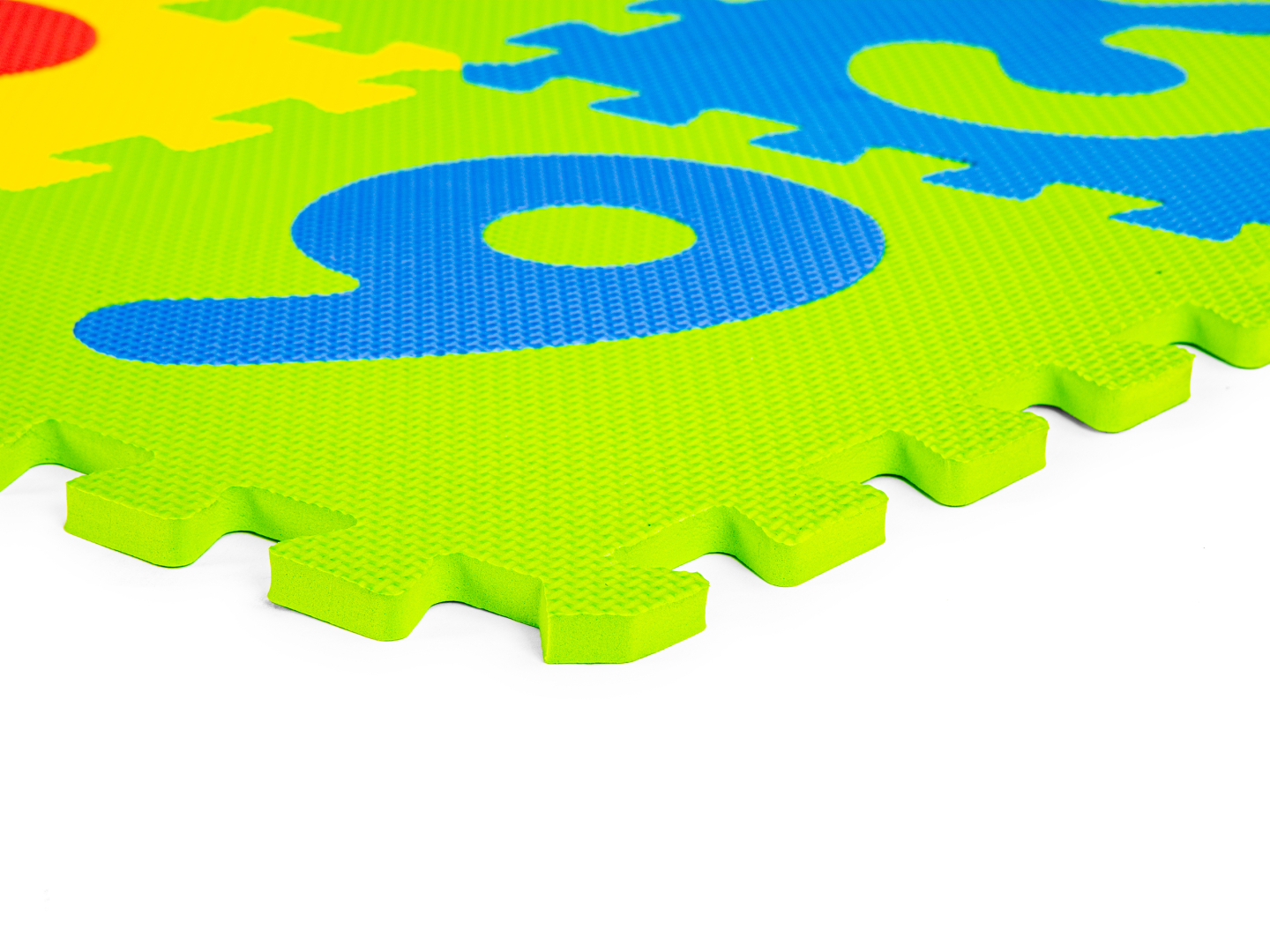 - Mata składa się kolorowych kwadratów, których brzegi posiadają specjalne „ząbki”, dzięki którym można je łączyć w dowolny sposób. Grubość maty (0,9 cm) zapewnia odpowiednią ochronę przy upadku i sprawia, że jest przyjemnie miękka.