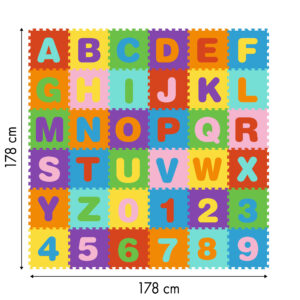 Ponieważ mata łączy się jak puzzle, można zbudować z niej wieżę, kostki i inne konstrukcje, które wymyśli dziecko. Każdą literkę oraz cyfrę można wyjąć z kwadratu, dzięki temu można bawić się układanie słów, liczenie, czy zabawę w dopasowywanie kształtów.