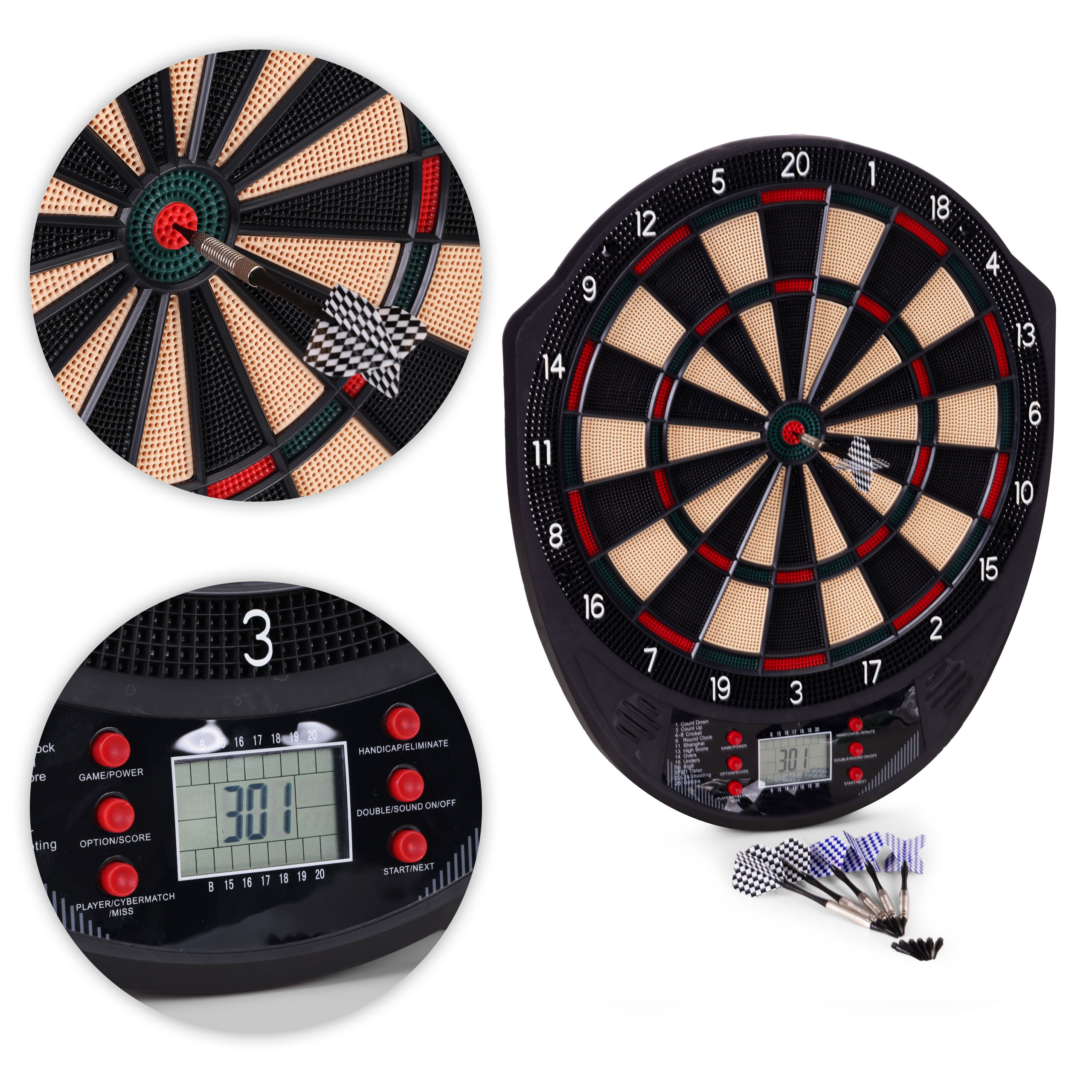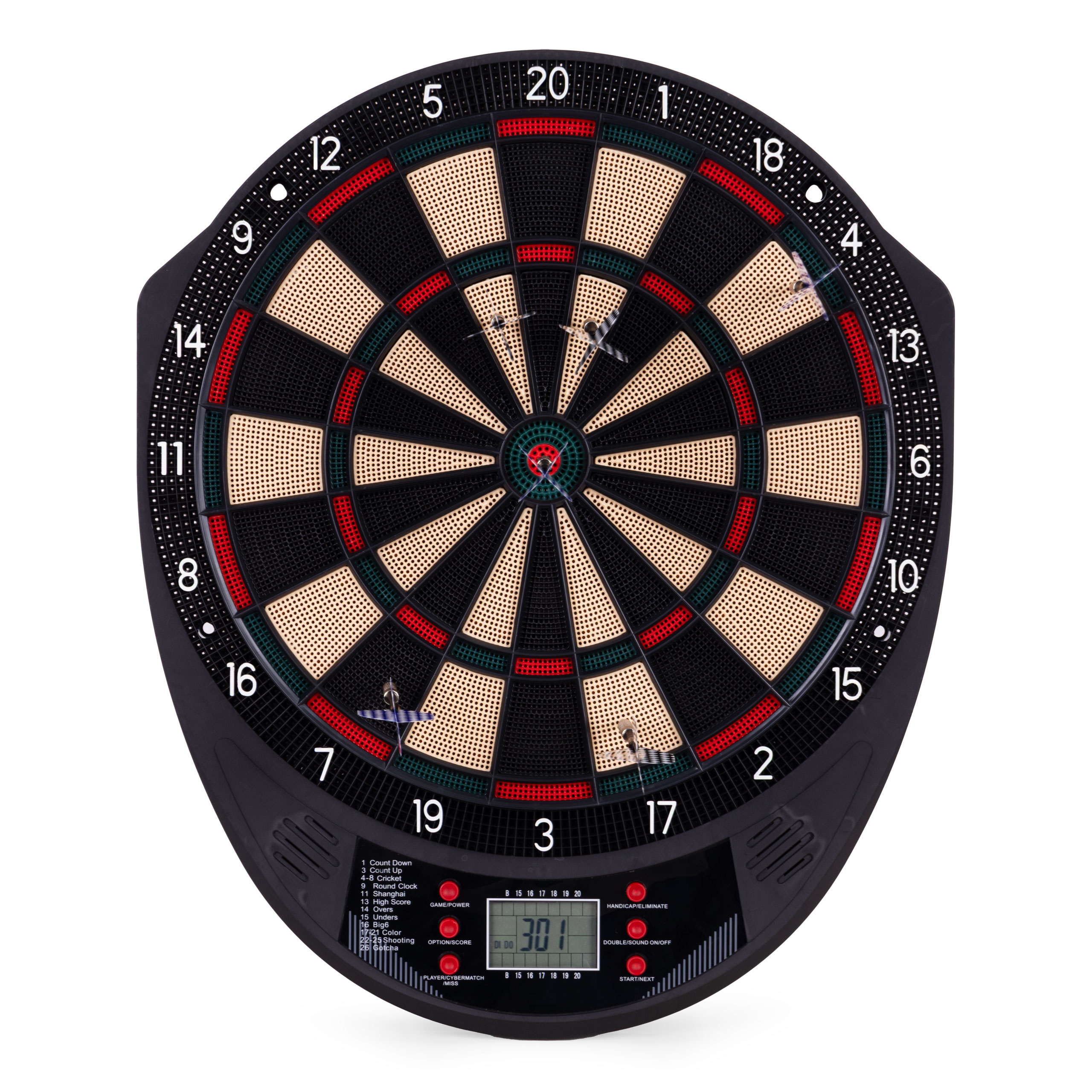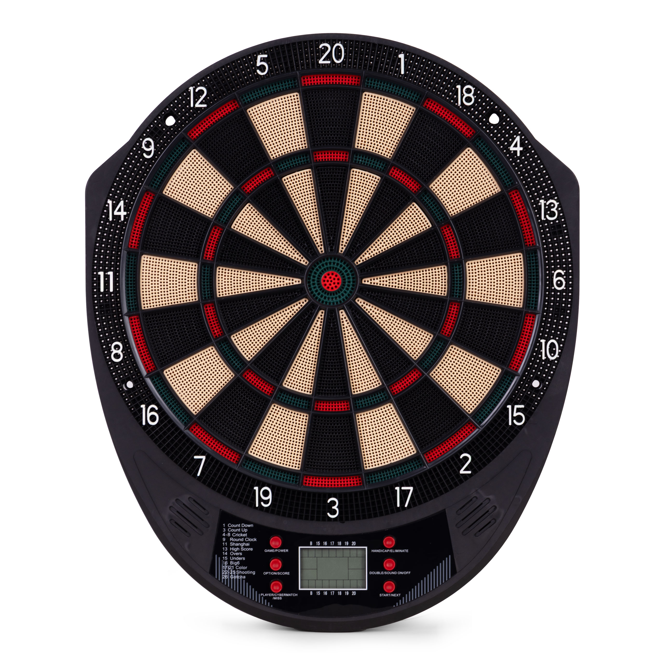Intuicyjny panel sterowania pozwala w łatwy sposób wybierać spośród aż 26 trybów gry i 185 wariantów rozgrywki. Wśród nich znajdziesz popularne klasyki, takie jak Count Down, Cricket, Gotcha, Round Clock czy Shanghai, ale też opcje bardziej zaawansowane, jak Cybermatch (gra przeciwko komputerowi) czy Handicap (wyrównywanie poziomów trudności). Wyświetlacz LCD pokazuje wynik, aktywnego gracza oraz status gry, a komunikaty głosowe prowadzą przez cały przebieg rozgrywki. W zestawie znajduje się także instrukcja w języku polskim, zawierająca szczegółowy opis każdej gry – wystarczy wybrać tryb i rozpocząć zabawę!