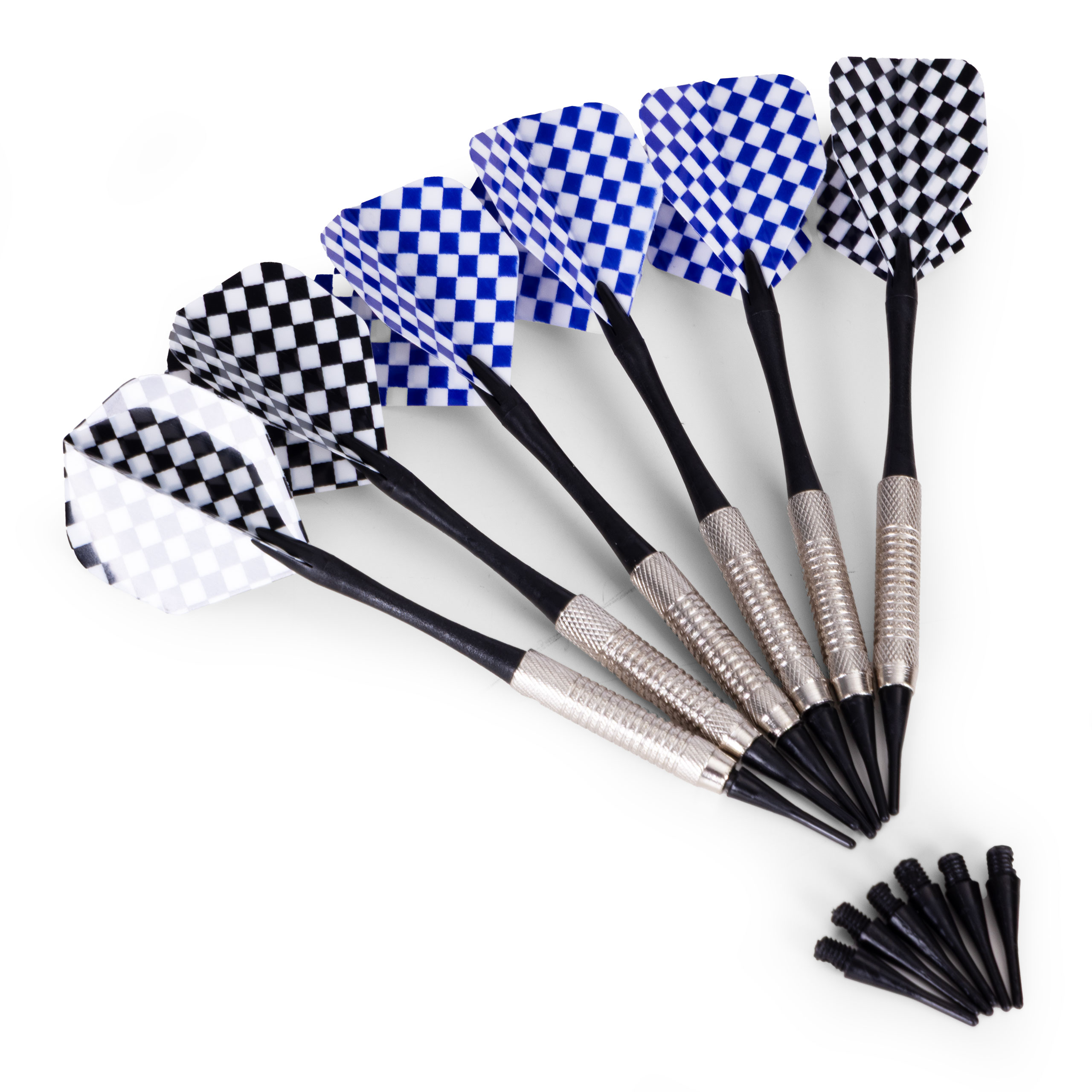 W zestawie otrzymujesz 6 rzutek z ozdobnymi piórkami w kolorach niebieskim oraz czarnym, co ułatwia szybkie rozróżnienie graczy lub drużyn podczas wspólnej rywalizacji. Rzutki wyróżniają się solidnym wykonaniem oraz odpowiednim wyważeniem, dzięki czemu pewnie leżą w dłoni i pozwalają na precyzyjne, powtarzalne rzuty. Zestaw uzupełnia komplet 6 zapasowych grotów, gwarantujących długą, bezproblemową zabawę bez przestojów.
