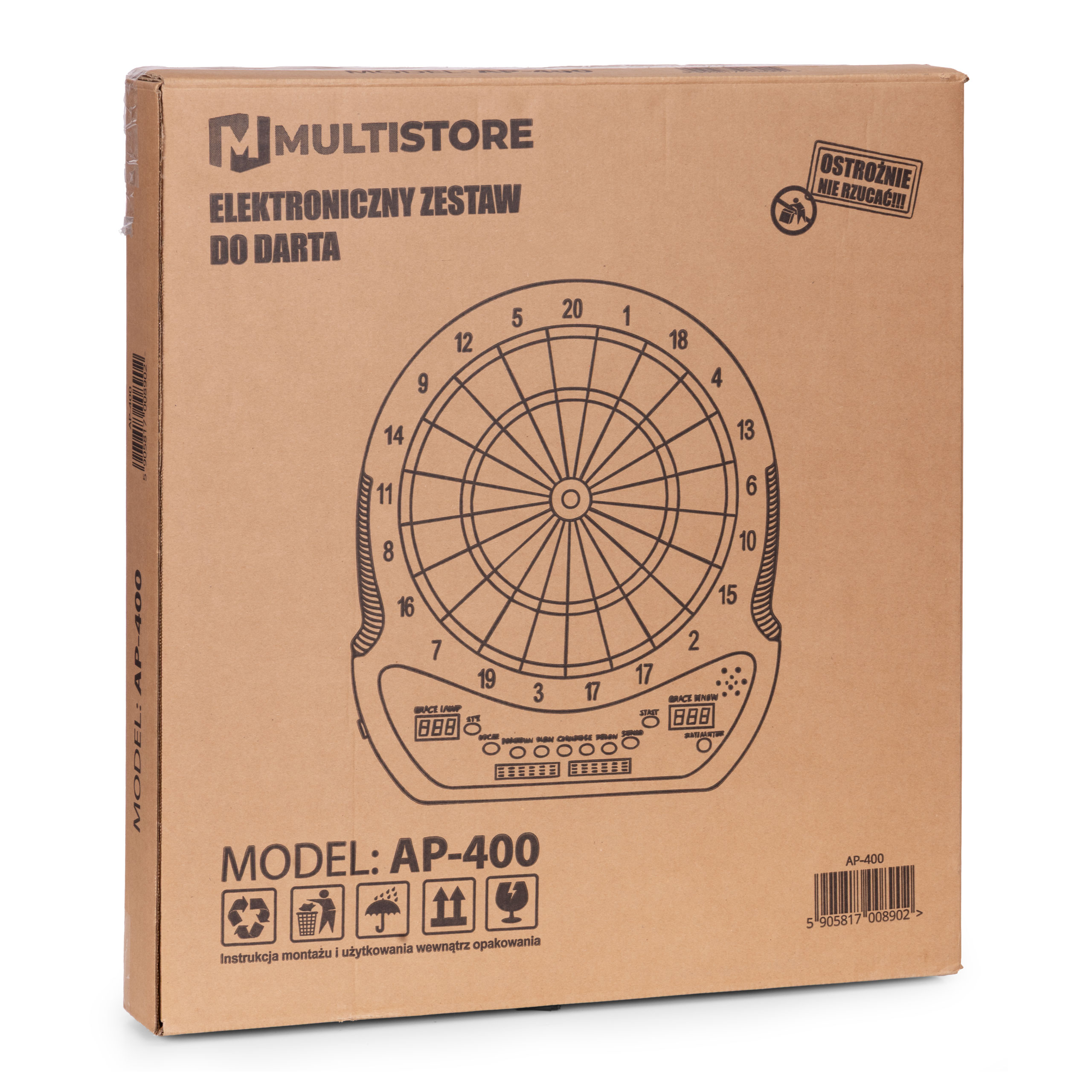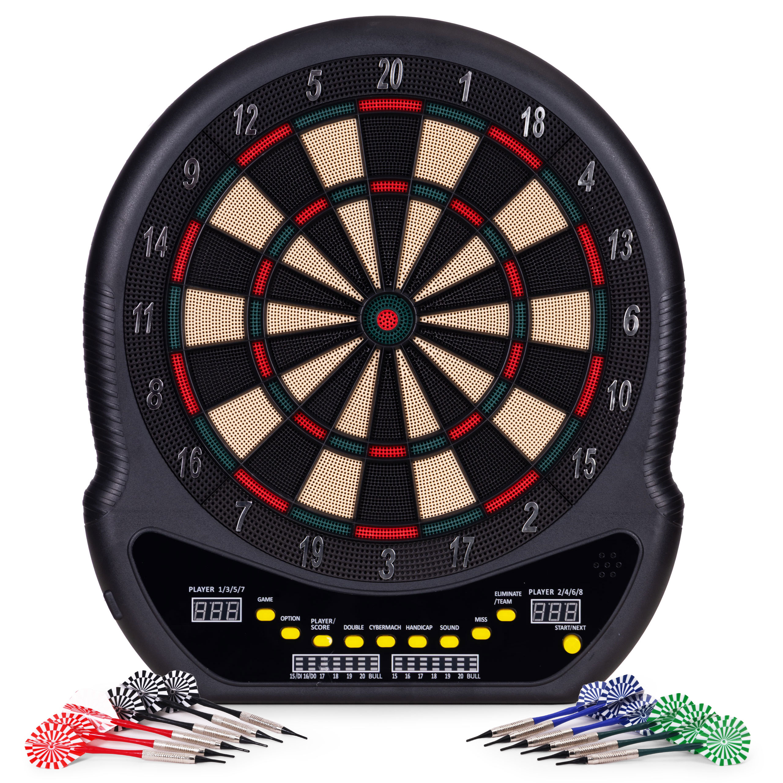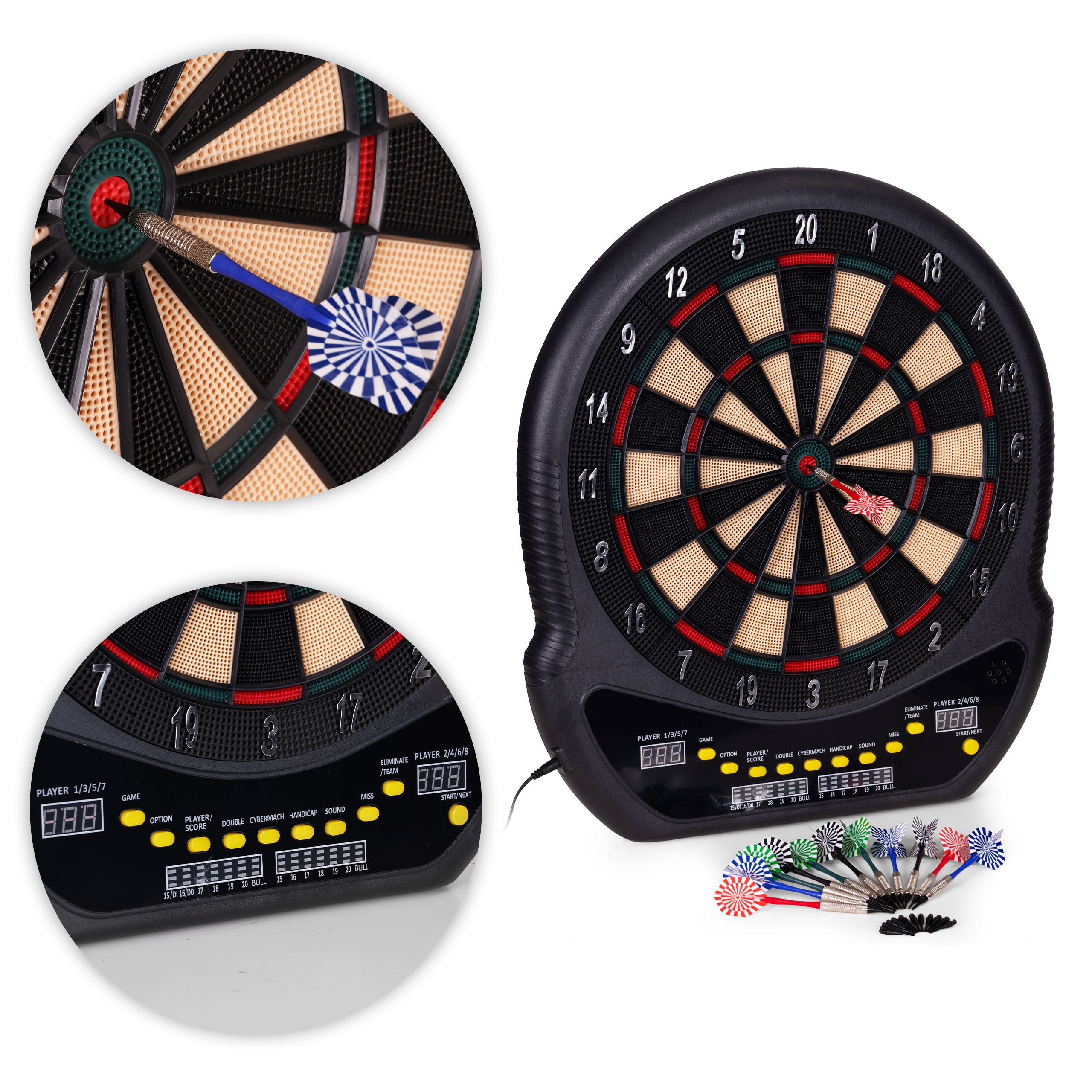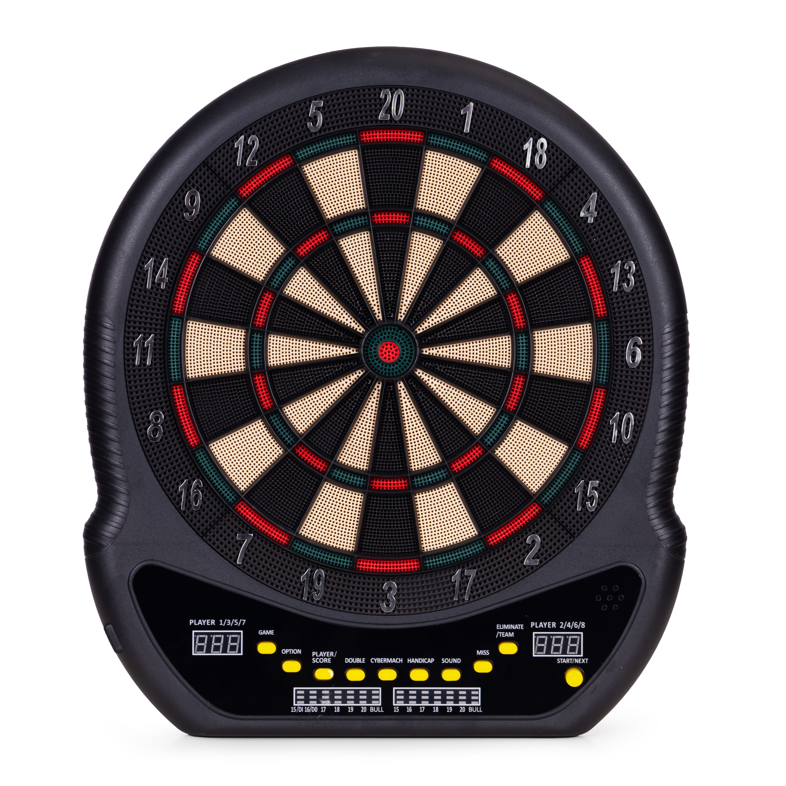 Intuicyjny panel sterowania umożliwia szybki wybór spośród aż 27 gier i 202 wariantów rozgrywki. Znajdziesz tu znane i lubiane tryby, takie jak Count Down, Cricket, Gotcha, Round Clock czy Shanghai, a także bardziej zaawansowane opcje, w tym Cybermatch (gra przeciwko komputerowi) oraz Handicap (regulacja poziomu trudności dla każdego gracza osobno). Dzięki dwóm wyświetlaczom LED, które pokazują punkty i aktywnego gracza, oraz wbudowanym komunikatom głosowym, każda rozgrywka przebiega dynamicznie oraz bez zbędnych przerw. Całość uzupełnia dołączona instrukcja w języku polskim, która krok po kroku opisuje zasady poszczególnych gier – wystarczy włączyć tarczę, wybrać tryb i rozpocząć emocjonującą zabawę!