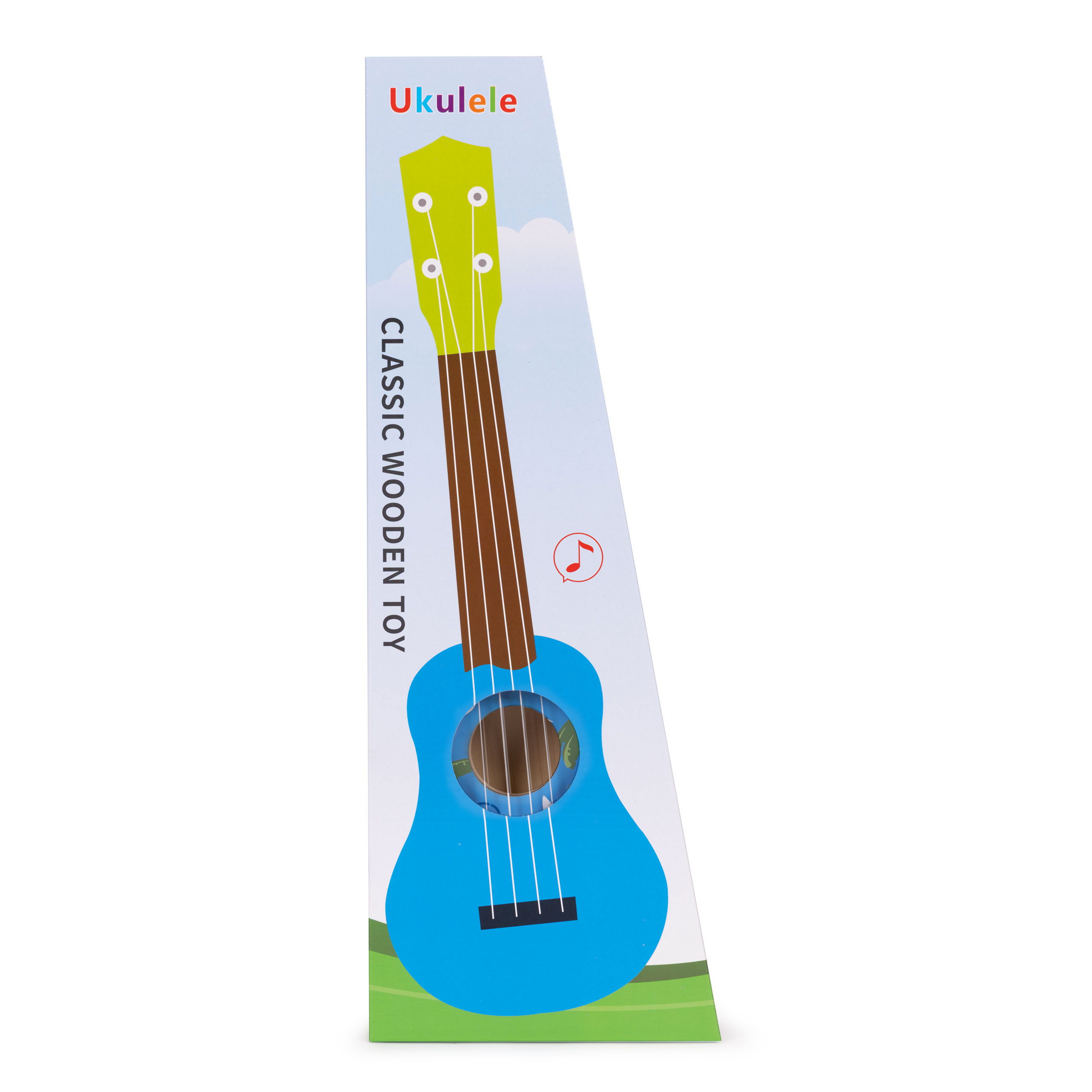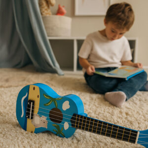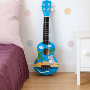 Gitara ukulele dla dzieci drewniana 4 struny nylonowe kostka do gry ECOTOYS