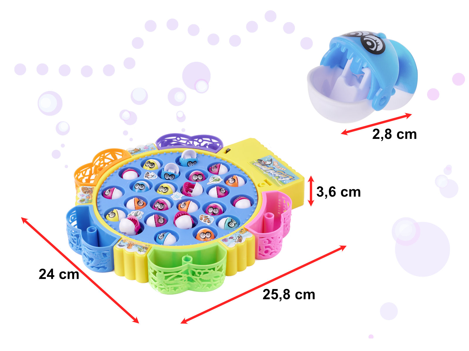 Fantastyczna gra dla całej rodziny polegająca na łowieniu rybek. Zasilanie: 2 baterie AA 1,5 V (brak w zestawie), Podstawy: 25,5cm x 23,5cm x 3,5cm, Rybki: 3cm x 2cm