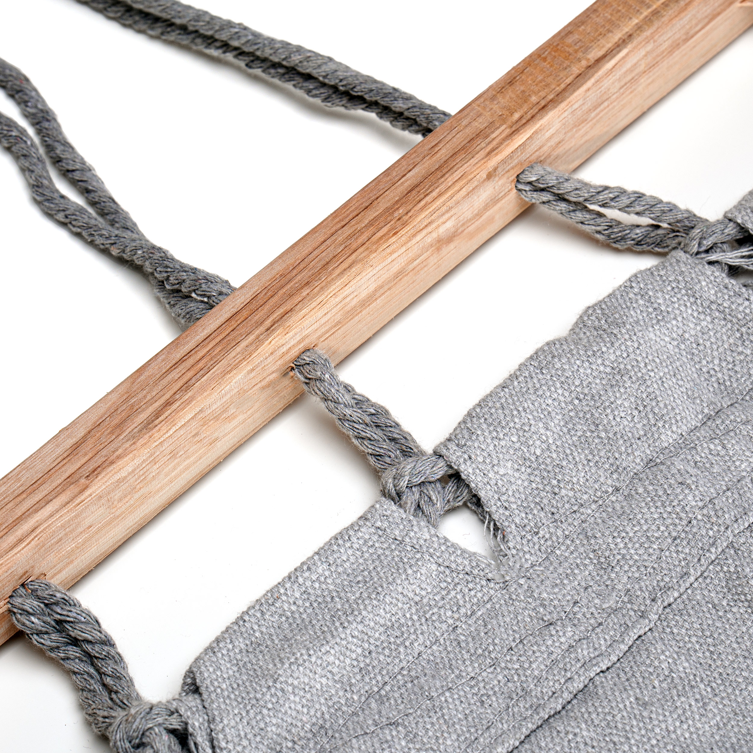 Materiał wykonania to wytrzymałe połączenie 70% bawełny i 30% poliestru, zapewniające komfort, a drewniane drążki stabilizujące dodają estetyki oraz równomiernie rozkładają ciężar, zwiększając komfort użytkowania.