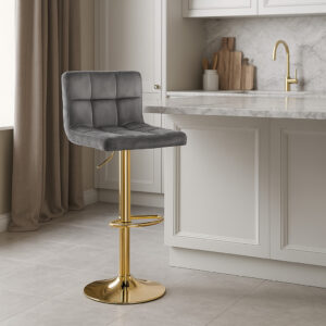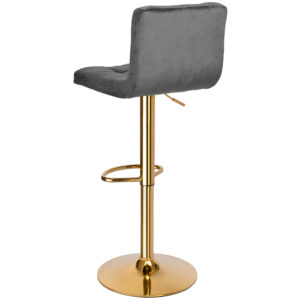 Hoker Arako posiada specjalnie profilowane oparcie, regulowaną wysokość i wygodny podnóżek. Cechuje go także stabilna, antypoślizgowa podstawa, dzięki czemu użytkowanie jest znacznie bezpieczniejsze. Prezentowany poniżej model odznacza się aksamitnym welurowym obiciem i modną, stabilną podstawą w eleganckim złotym kolorze. Ciekawe, geometryczne przeszycia tworzą przyciągający uwagę wzór kraty, obok której nikt nie przejdzie obojętnie. To wszystko sprawia, że model świetnie pasuje do nowocześnie urządzonych wnętrz. Sprawdzi się w każdym wnętrzu, zarówno w przestrzeni mieszkalnej jak i lokalach usługowych, takich jak salon fryzjerski czy punkt informacyjny.