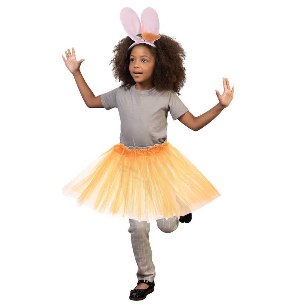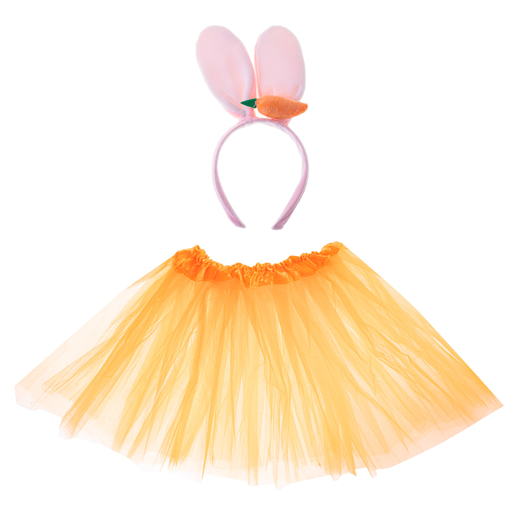 Kostium króliczka, który doskonale przyda się na bal przebierańców, Halloween czy imprezę tematyczną. W zestawie znajduję się 3-warstwowa spódniczka tiulowa i opaska z usztywnianymi uszkami i marchewką. Wym. spódniczki: 48cm x 40,5cm. Wys. opaski: 29cm.
