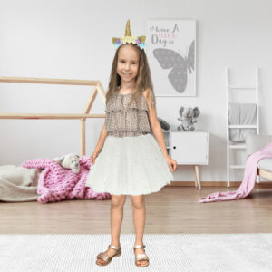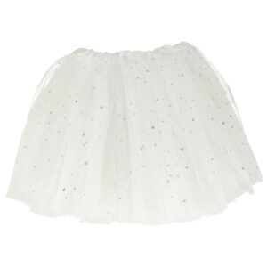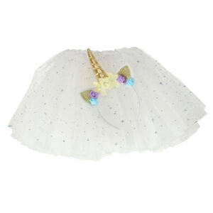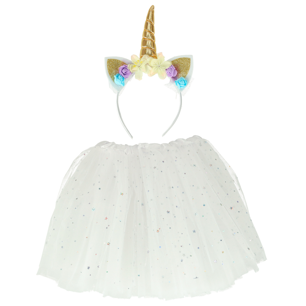 Strój składający się ze spódniczki i opaski jednorożca. Wielowarstwowa spódniczka ozdobiona błyszczącymi gwiazdkami. Doskonałe przebranie np. na bal karnawałowy. Strój wykonany z poliestru. Kostium dostępny w kolorze białym. Dł. spódnicy: 30cm.