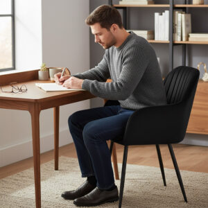 Tapicerowane i pikowane krzesło z przeszyciami. Ciekawy i wyrazisty wzór, który idealne wkomponuje się do wnętrz w stylistyce skandynawskiej lub vintage, nadając nieco ciepłego wyrazu. Siedzisko jest wyprofilowane i zapewnia komfortowe oparcie dla pleców. Metalowe nogi krzesła zapewniają stabilne podparcie na każdej powierzchni. Kupując u nas, kupujesz od bezpośredniego producenta!