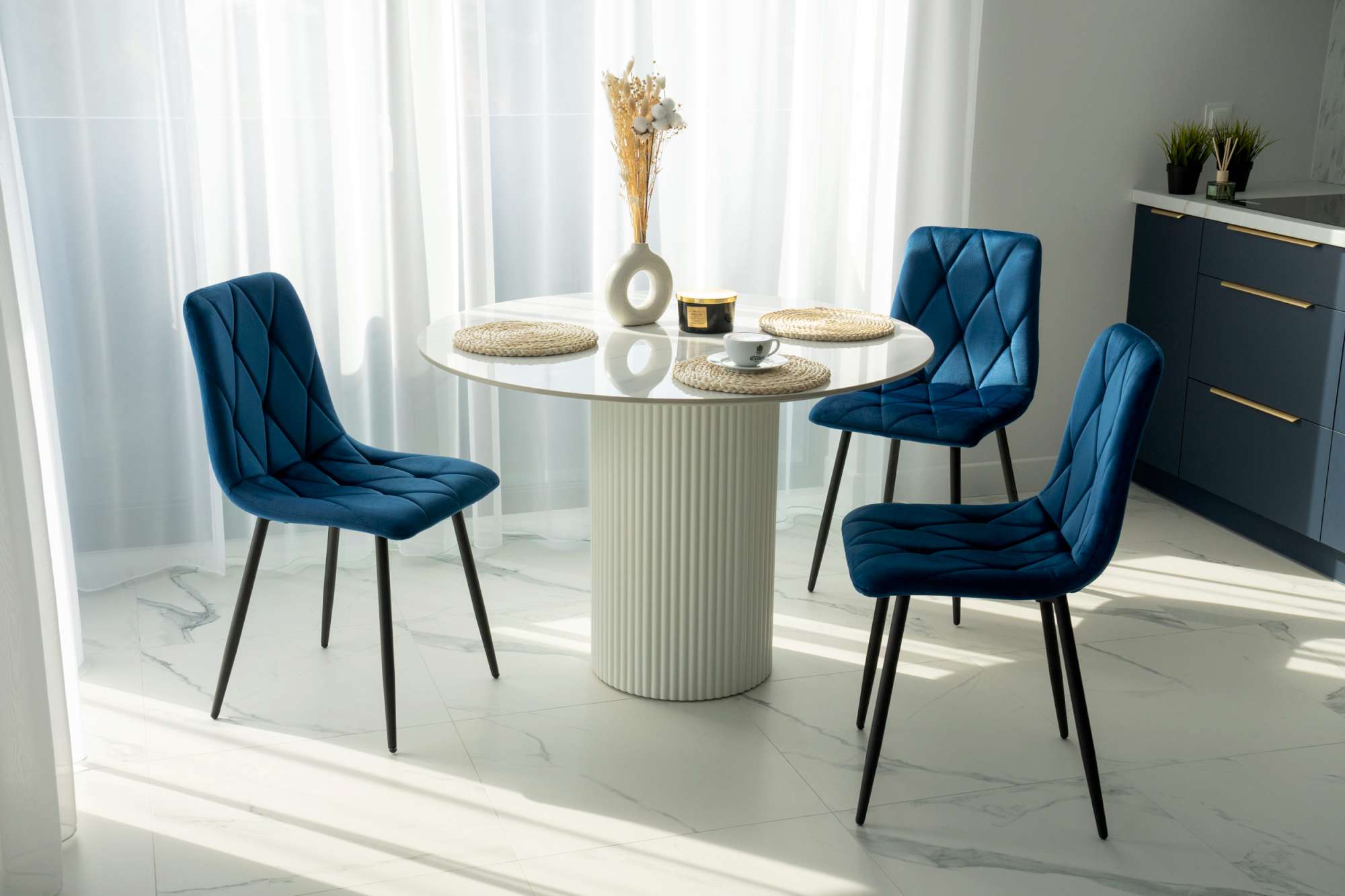 Krzesło Madison to wyjątkowe krzesło zaprojektowane pod kątem stylu glamour oraz loft. Tapicerowane miękką aksamitną tkaniną z delikatnymi przeszyciami tworzącymi przyciągający wzrok wzór. Niezwykle wygodne o ergonomicznym kształcie. Nogi w kolorze czarnego matu