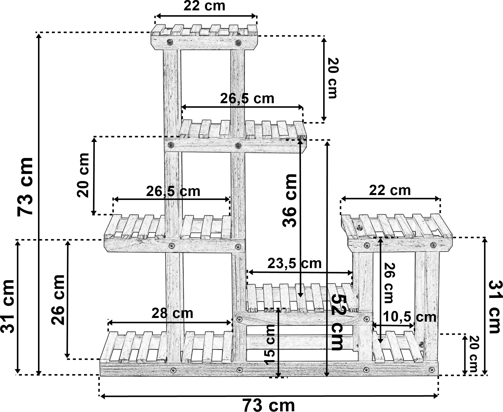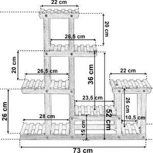Kwietnik Manino został wykonany z mocnego i wytrzymałego drewna sosny nowozelandzkiej oraz poddany procesowi karbonizacji. Posiada 5 poziomów półek z dużą nośnością, dzięki czemu bez obaw można na nim postawić wiele doniczek. Stojak na kwiaty posiada półki o różnej długości i wysokości, co pozwala na umieszczenie na nim roślin w zależności od ich wymiarów. Odpowiedni wzrost zapewni ustawienie kwiatów w pewnej odległości od siebie. Drewniana konstrukcja gwarantuje stabilność półki. Kwietnik sprawdzi się idealnie wewnątrz domu. Można go używać także jako regał na książki, zdjęcia, czy pamiątki. Łatwy w montażu: nasz kwietnik jest łatwy w montażu, wystarczy postępować zgodnie z instrukcją. W zestawie znajdują się wszystkie niezbędne elementy.