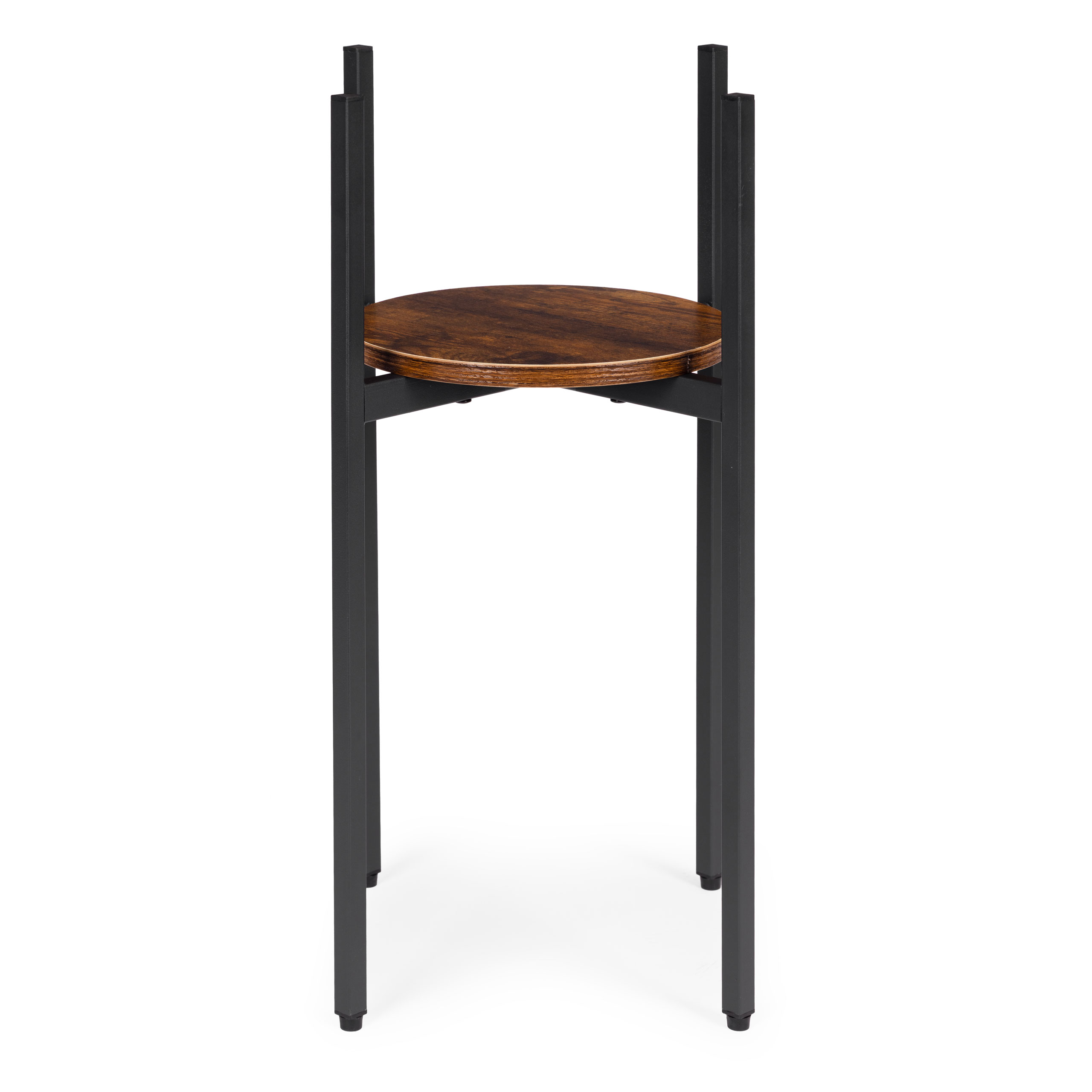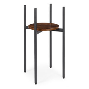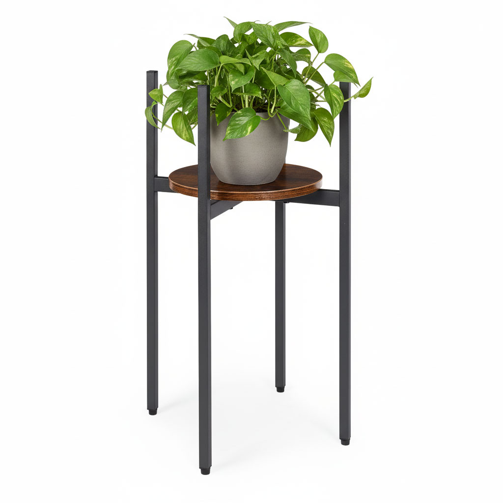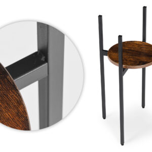 Stojak na kwiaty został wykonany ze stali malowanej proszkowo, co zapewnia odporność na korozję oraz uszkodzenia mechaniczne. Półkę z płyty wiórowej wykończono w kolorze imitującym naturalne drewno, co podkreśla dekoracyjny, loftowy charakter mebla.