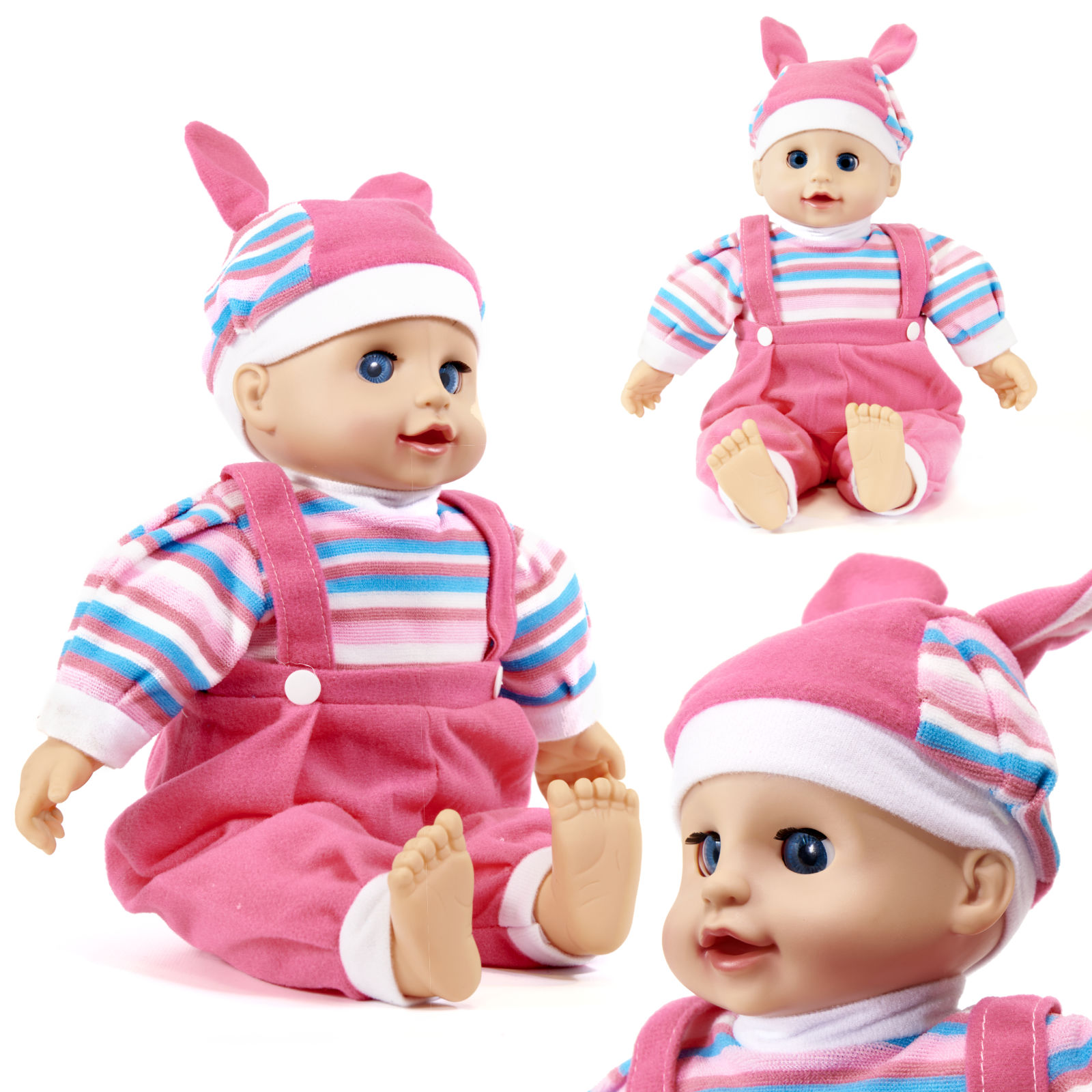 Urocza lalka Maja przypominająca prawdziwe dziecko. Po naciśnięciu na brzuszek wydaje 4 rodzaje dźwięków. Zamyka oczy, kiedy się ją położy. Ubrana w różowe spodenki i bluzeczkę w paski. Zasilanie: baterie 3x LR44 (w zestawie). Wysokość: 40cm.