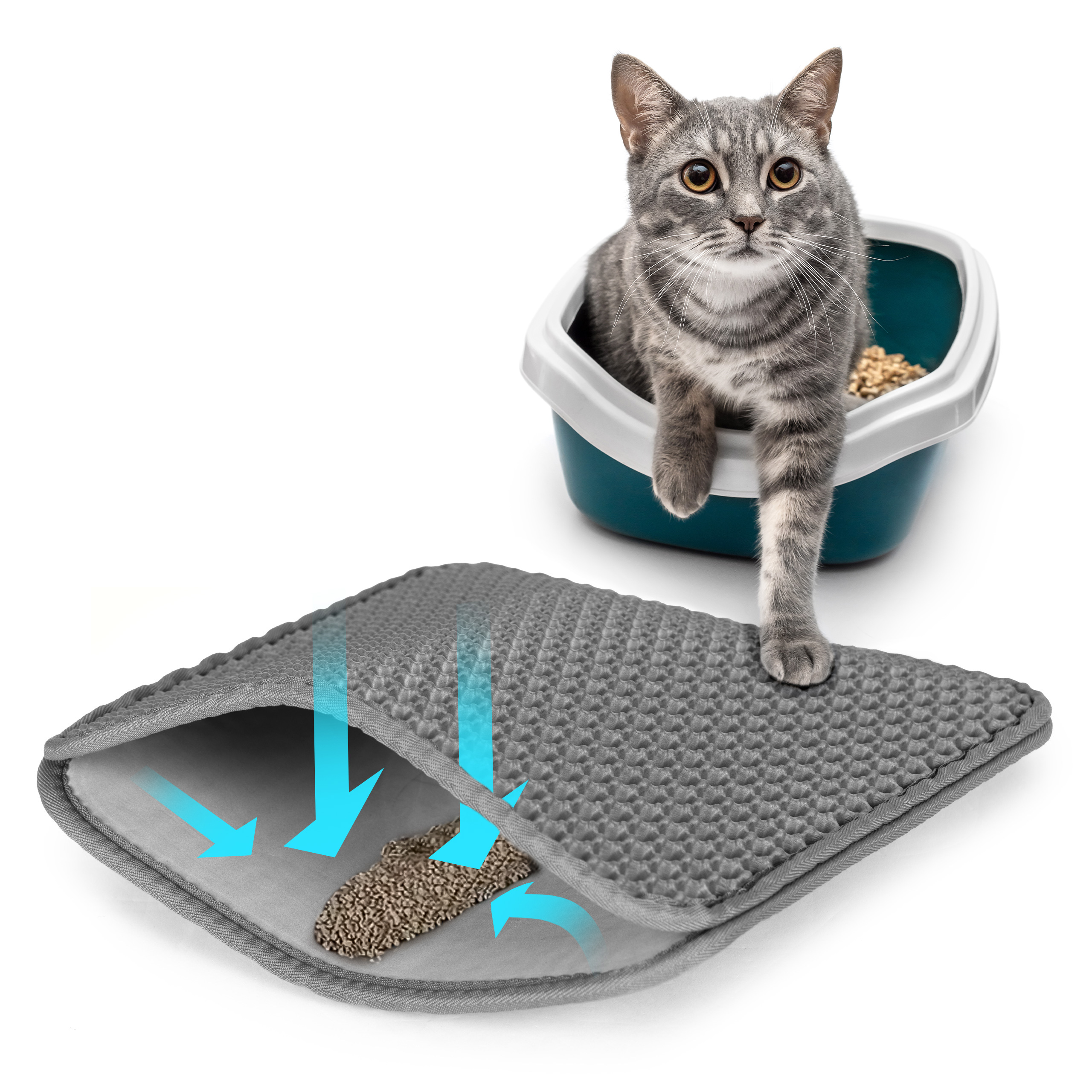 Wystarczy, że ustawisz ją przed kuwetą, a wychodzący z niej kot pozostawi resztki żwirku na macie. Zabrudzenia wpadną przez specjalne oczka górnej warstwy i zbiorą się w środku maty. Dzięki temu utrzymasz porządek wokół kuwety.