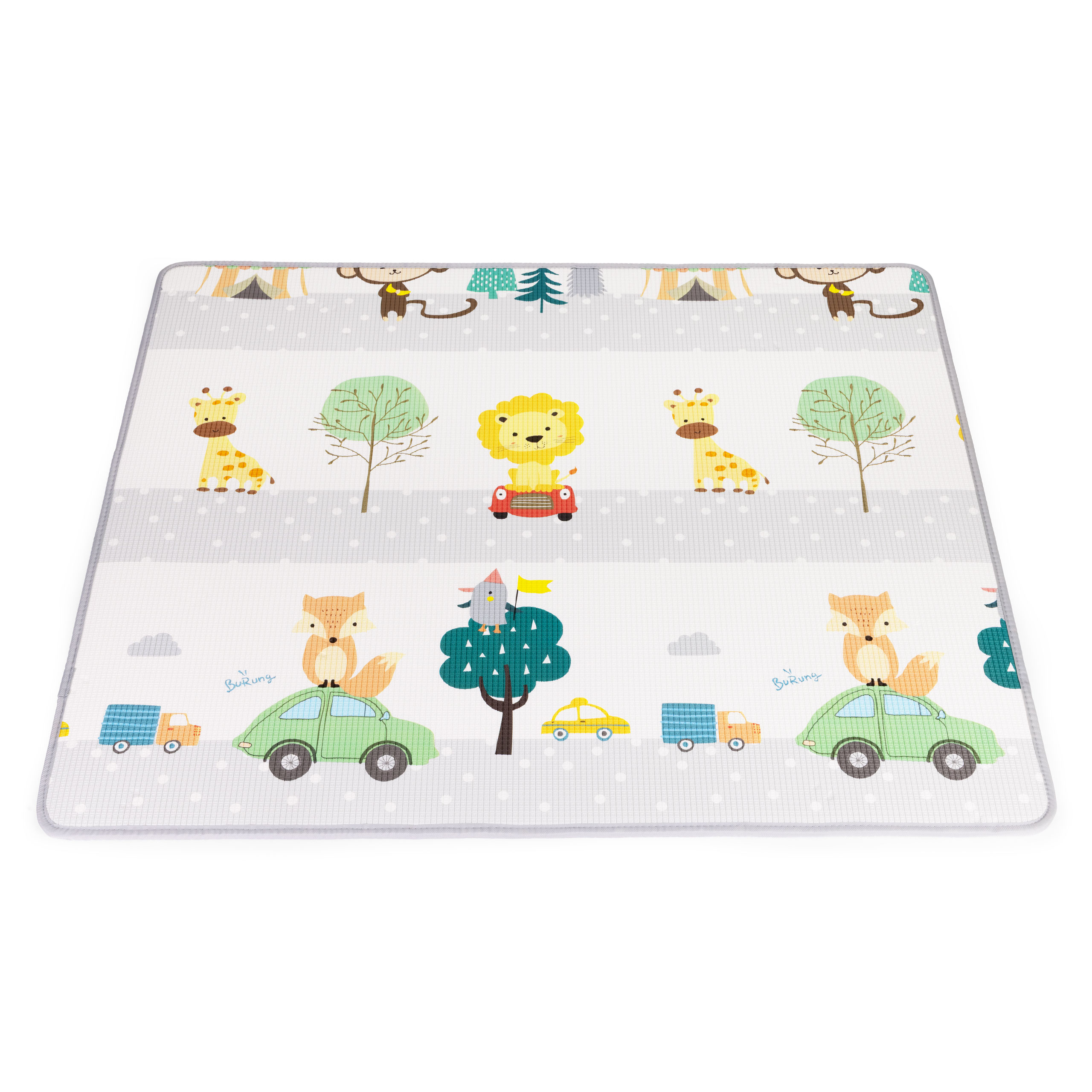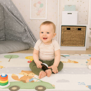- Mata została wyposażona w antypoślizgowe wypustki po obu stronach, które skutecznie zapobiegają jej przesuwaniu się po podłodze. Dzięki temu nawet podczas aktywnej zabawy mata pozostaje na swoim miejscu, umożliwiając dziecku raczkowanie, bawienie się i stawianie pierwszych kroków w stabilnych warunkach.