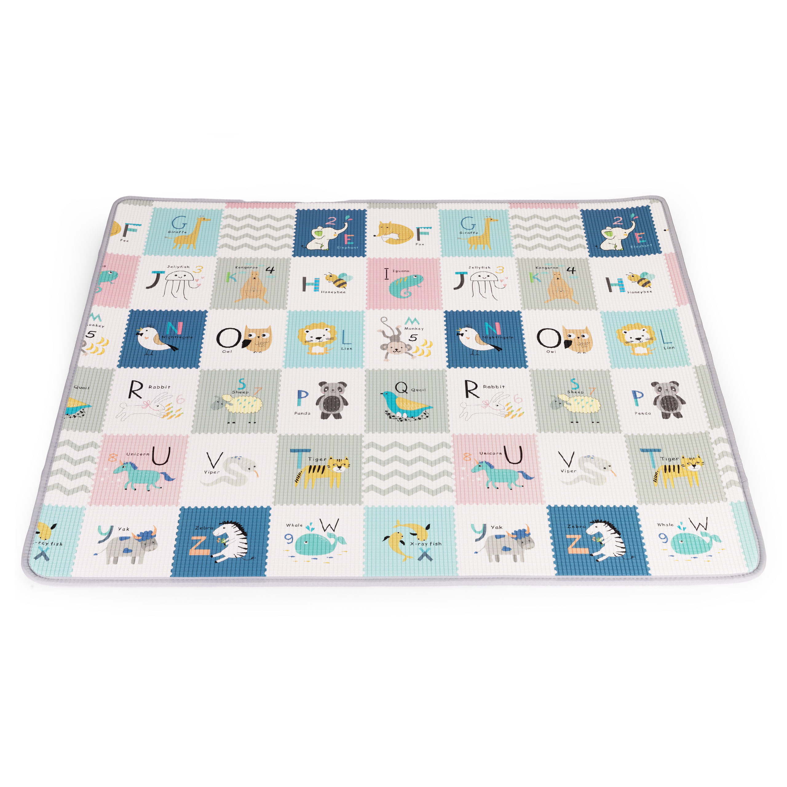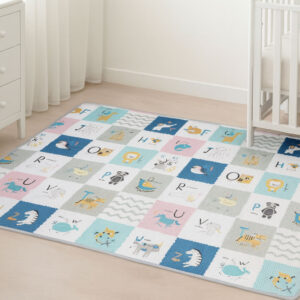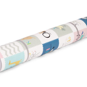 Mata jest dwustronna, co sprawia, że dzieci mogą czerpać z niej podwójną ilość zabawy oraz nauki. Jedna strona przedstawia wesołą, edukacyjną planszę z alfabetem, gdzie każdej literze towarzyszy kolorowy rysunek i angielskie słowo – idealne do nauki przez zabawę. Druga strona zachwyca ilustracjami zwierzątek, pojazdów i elementów przyrody, tworząc ciepłą oraz przyjazną przestrzeń do codziennej zabawy. Delikatne kolory i urocze postacie pobudzają wyobraźnię, a także tworzą przyjemny klimat w dziecięcym pokoju.