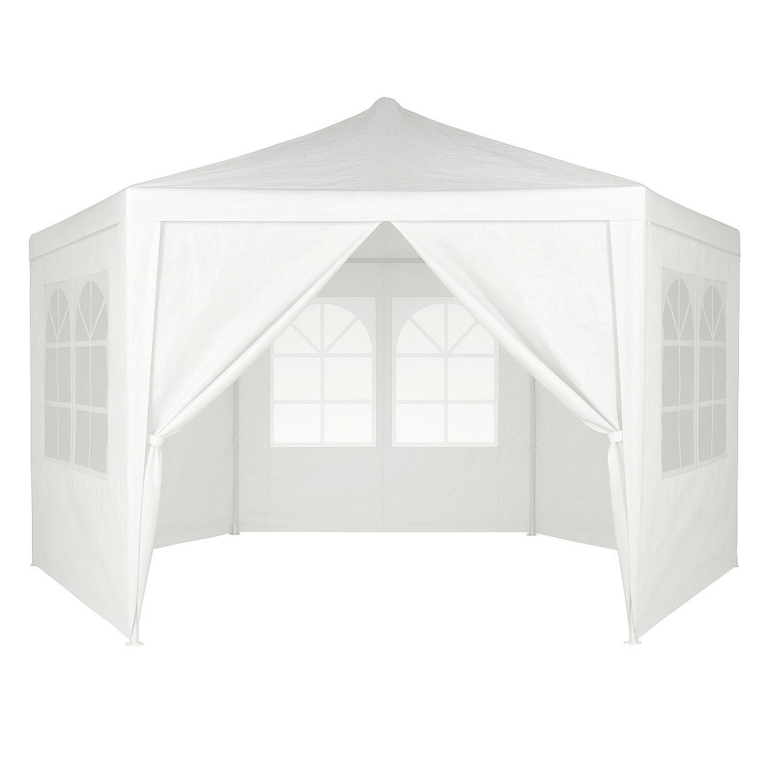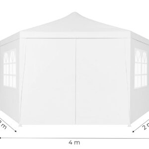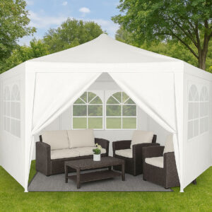 Ściany pawilonu wyposażone są w duże okna, które zapewniają dostęp naturalnego światła do wnętrza, jednocześnie chroniąc przed wiatrem i opadami. Dzięki nim wnętrze pawilonu jest jaśniejsze oraz bardziej przyjazne, co zwiększa komfort użytkowania podczas spotkań, przyjęć czy wydarzeń plenerowych. Namiot posiada wejście zapinane na zamek błyskawiczny, zapewniające szybki i wygodny dostęp do wnętrza namiotu. To praktyczne rozwiązanie, które ułatwia korzystanie z pawilonu, zwłaszcza gdy często przemieszczasz się między jego wnętrzem, a otoczeniem.