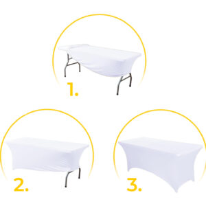 Pokrowiec sprawi, że nawet mało reprezentacyjny stół stanie się niezwykle gustownym elementem dekoracyjnym na uroczystości. Stosując ten elastyczny obrus możesz pięknie zaprezentować słodki kącik na weselu, rękodzieło na wystawie czy catering podczas biznesowego spotkania. Elastyczny materiał sprawia, że łatwo założysz go i zamocujesz na nogach stołu, dzięki czemu obejmie on cały mebel, napinając się i nadając mu elegancji.