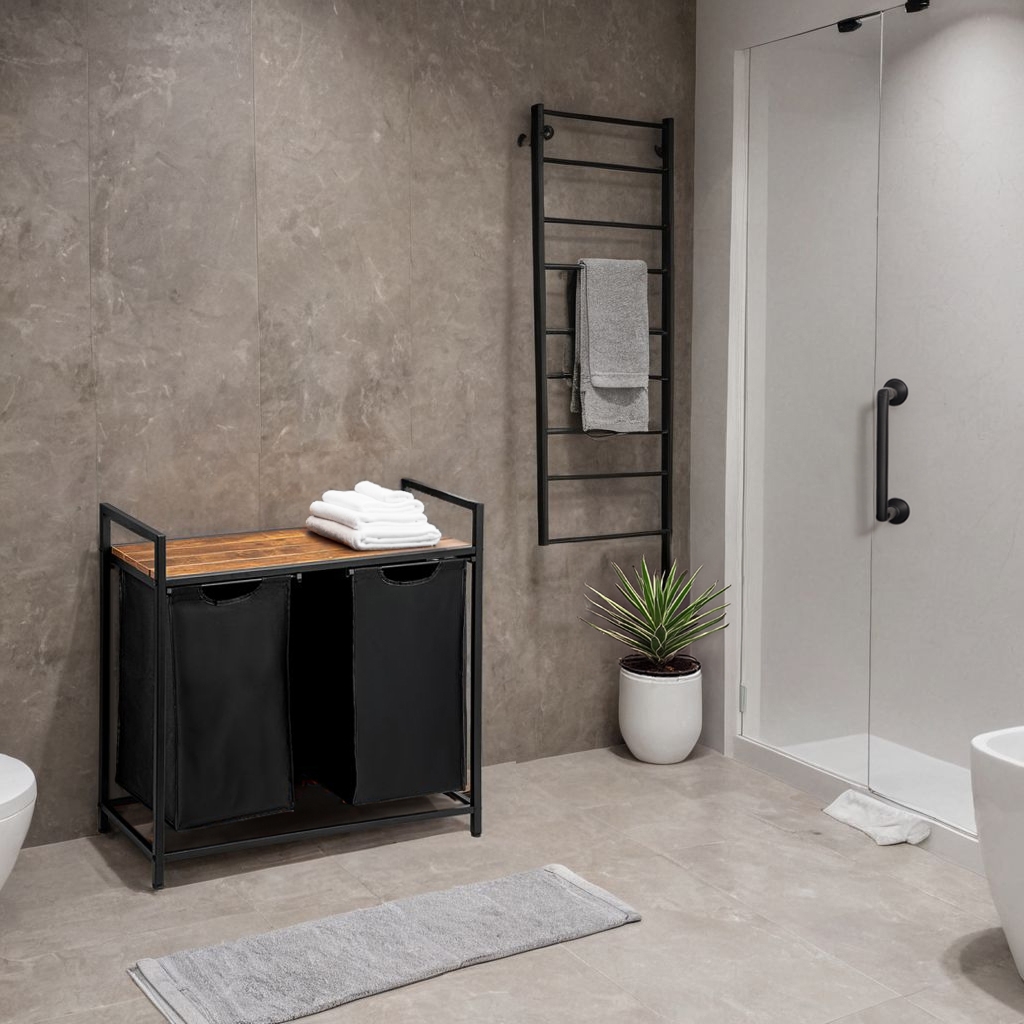 Kosz na pranie Artus to stylowe i praktyczne rozwiązanie do każdej łazienki. Wykonany z malowanego proszkowo metalu, jest trwały i odporny na uszkodzenia. Gładkie wykończenie bez ostrych krawędzi zapewnia bezpieczeństwo użytkowania, a górna półka oferuje dodatkowe miejsce na akcesoria łazienkowe, środki piorące czy dekoracje. Dzięki metalowym szynom materiałowe worki łatwo się wysuwają, co ułatwia ich napełnianie i opróżnianie. Worki z tkaniny Oxford 600D można łatwo zdjąć i wyprać, co gwarantuje higienę i świeżość. Prosty montaż bez potrzeby wiercenia sprawia, że kosz Artus jest gotowy do użycia w kilka chwil – wszystko, co potrzebne do złożenia, znajduje się w zestawie.