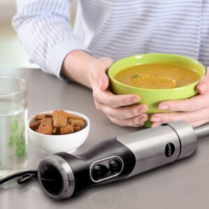 Ma ergonomiczny kształt, wygodny uchwyt i metalową końcówkę rozdrabniającą. Prędkość pracy urządzenia ustawia się za pomocą poręcznego regulatora, a zmieniając jego położenie, można wybrać nawet 5 różnych prędkości. Do natychmiastowego uzyskania najwyższego tempa obrotów służy natomiast przycisk TURBO. Rozdrabniacz posiada funkcję pracy pulsacyjnej i jest bardzo łatwy w czyszczeniu. W mig przygotujesz z jego pomocą ulubiony napój i rozdrobnisz produkty do pożądanej konsystencji, a umycie urządzenia zajmie Ci dosłownie kilka chwil.