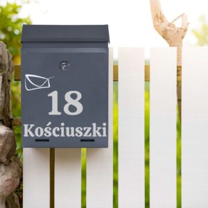 Możliwość wykonania dowolnego napisu: nr domu, nazwa firmy, nazwisko, ulica itp. Napis wykonany jest metodą ploterową folią Oracal, odporną na warunki atmosferyczne. Folia jest w kolorze srebrnym