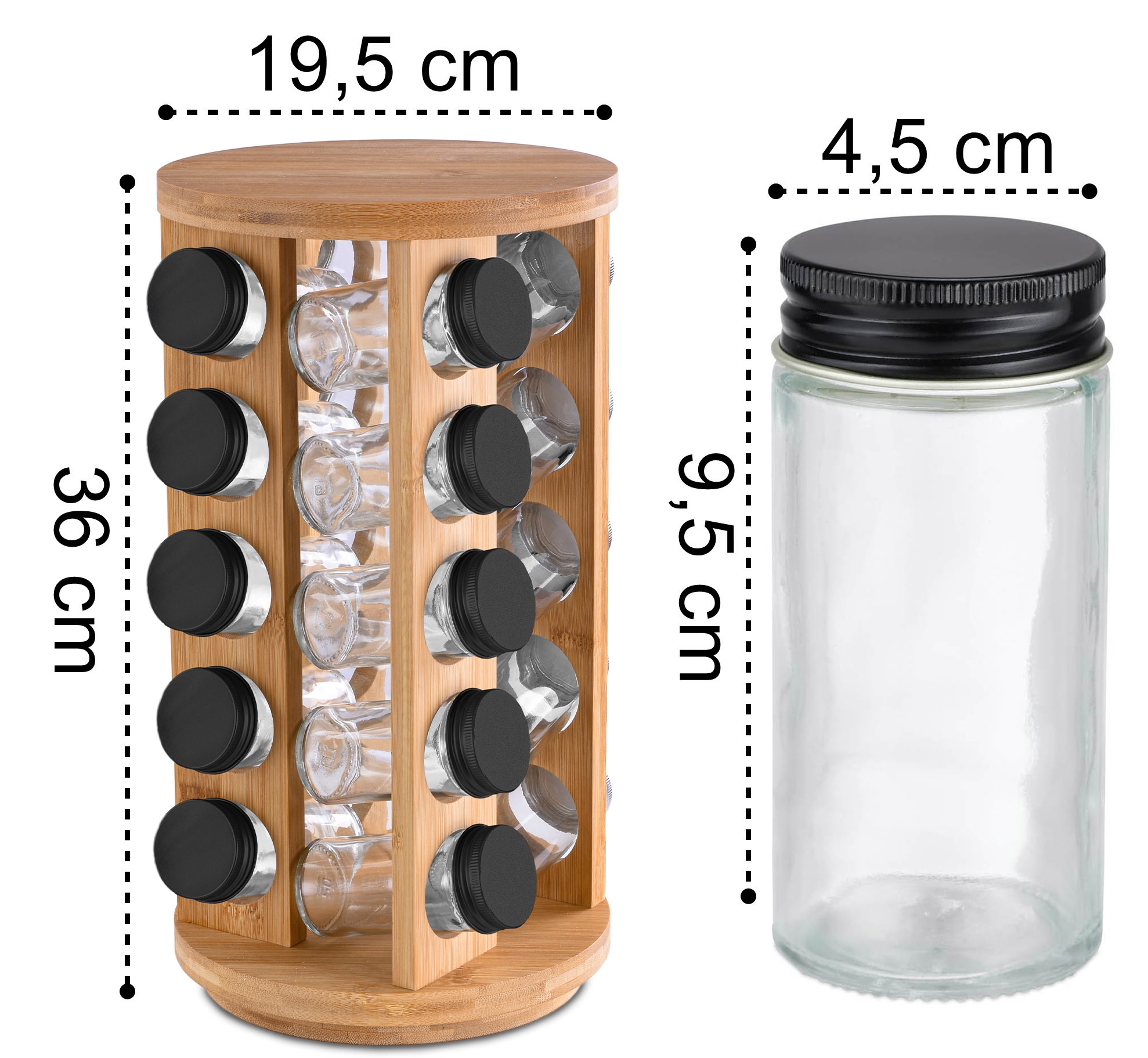 ⭐Drewno bambusowe⭐20 szklanych słoiczków⭐72 naklejki⭐Obrotowy 360°