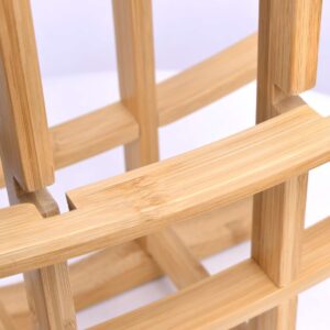 Ten wysokiej jakości stojak na wino wykonany z drewna bambusowego zmieści do 12 butelek wina. Ergonomiczny- zabiera niewiele miejsca a pomieści naprawdę sporo. Stojak zachwyca przede wszystkim swoją naturalnością i odrobinę azjatyckim designem. Dzięki dwóm bocznym częściom i zakrzywionym poprzecznym rozporom przypomina japońskie bramy i przyciąga wzrok. Dzięki odporności na wilgoć, stojak na butelki nadaje się również do kuchni. 4 podkładki z miękkiej gumy zapewniają bezpieczne ustawienie, a jednocześnie chroni powierzchnię przed nieestetycznymi zadrapaniami. Stojak zapewni idealne przechowywanie butelek z winem – korki nie wysychają.
