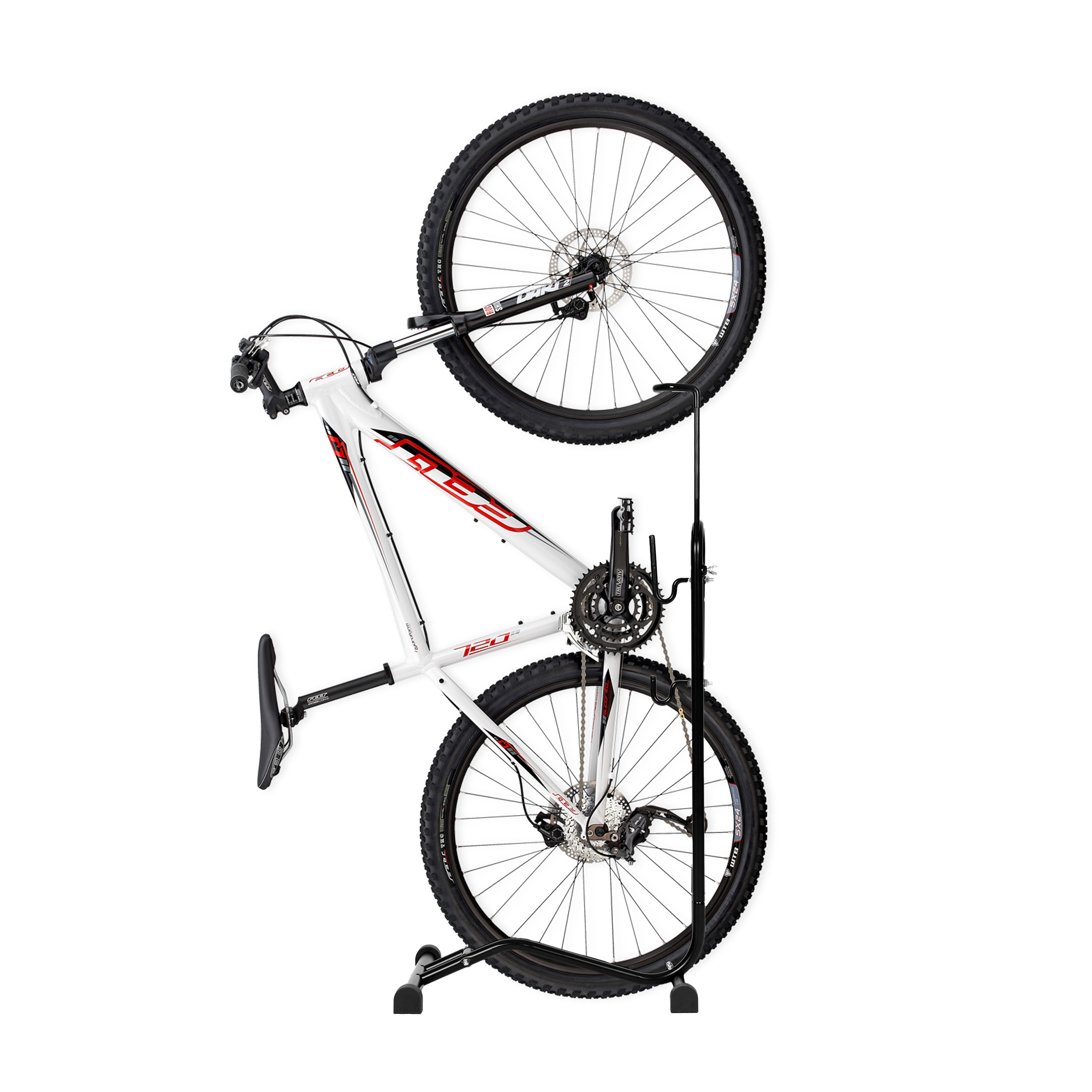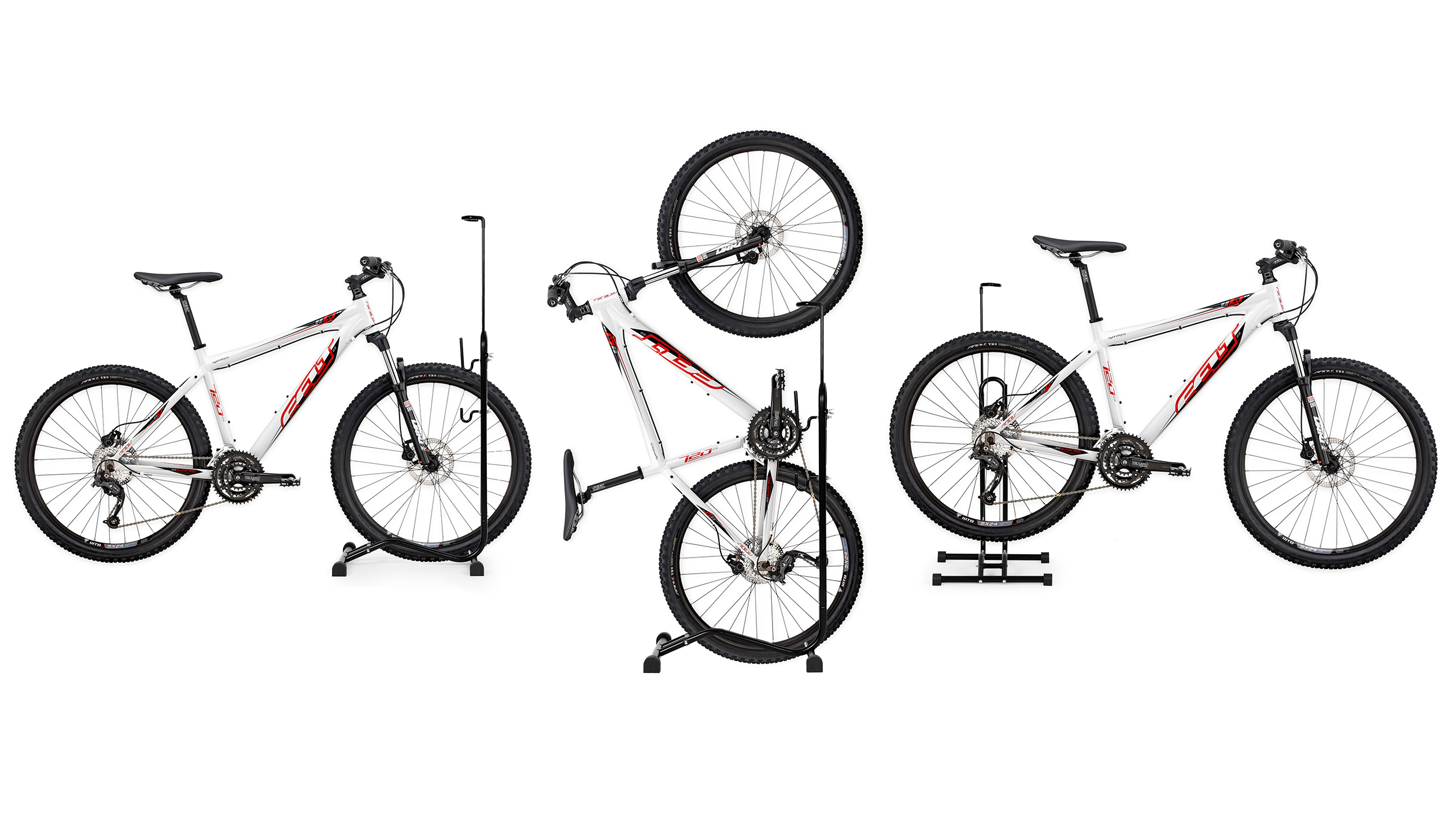 - Przechowywanie roweru – mocowanie roweru w stojaku odbywa się poprzez wprowadzenie koła do uchwytu dolnego. Jeśli planujemy trzymać rower poziomo wprowadzamy koło przednie lub tylne.