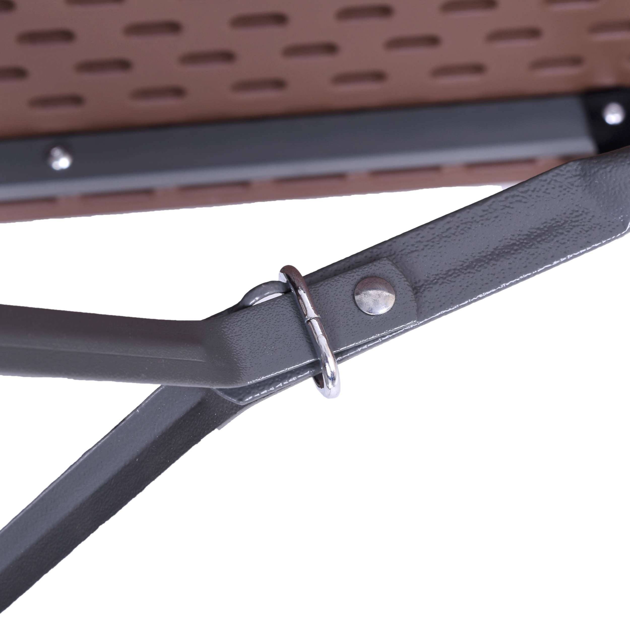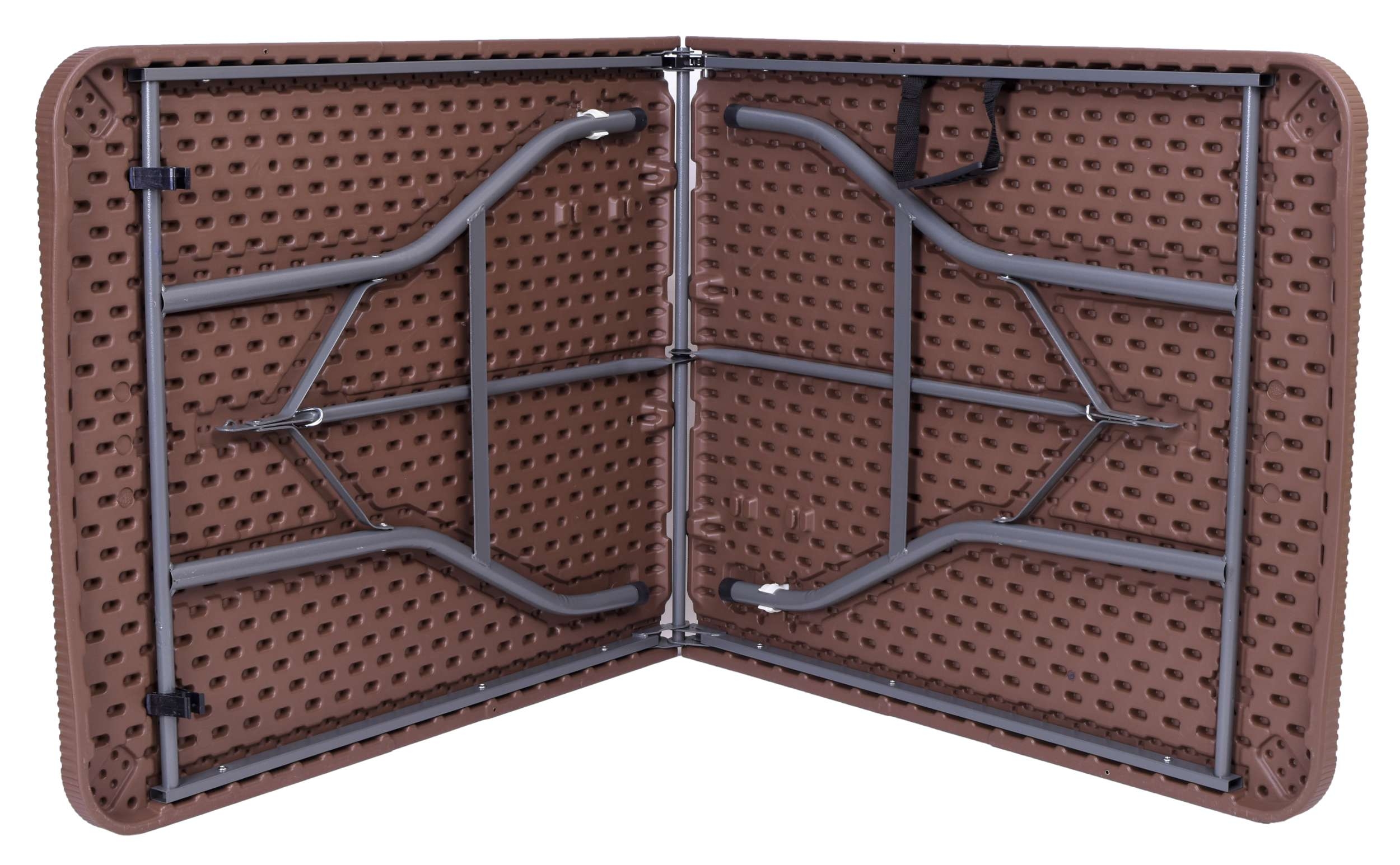 Składany stół cateringowy. Bardzo praktyczny i lekki. Konstrukcja wykonana ze stali malowanej proszkowo. Blat wykonany z polietylenu HDPE. Wzorowany na rattan. Odporny na promienie słoneczne. Dzięki unikalnemu projektowi całość konstrukcji chowa się w blat stołu, zajmując mało miejsca i tworząc ergonomiczną walizkę, łatwą do przenoszenia.