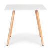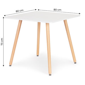 Nogi stołu wykonane są z wytrzymałego drewna bukowego, na ich końcach znajdują się specjalne, ruchome stopki, które pomogą w wypoziomowaniu stołu oraz pozwolą uniknąć zarysowań podłogi. Blat zrobiony został z płyty MDF pokrytej odporną okleiną w kolorze matowej bieli, pod nim znajduje się metalowy stelaż, w którym osadza się nogi stolika.