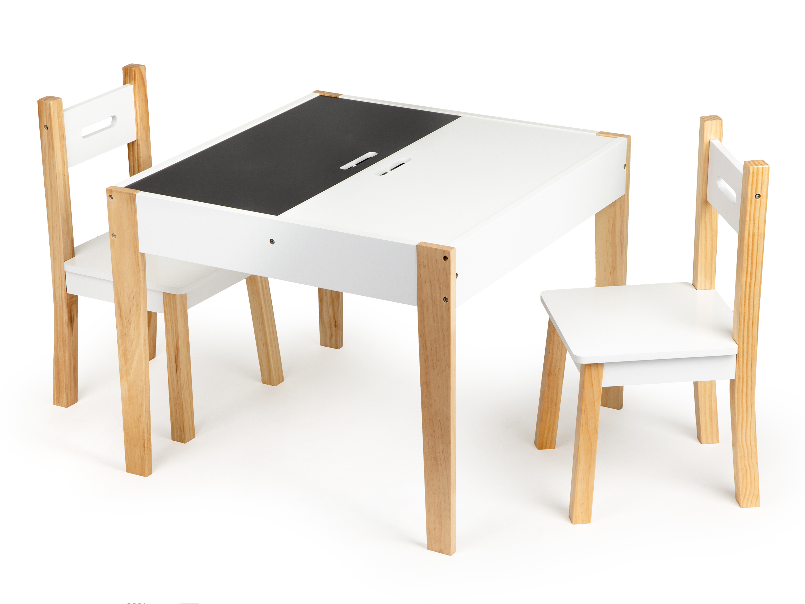 Jedną z części blatu można zamienić w tablicę do pisania kredą, wystarczy obrócić ją na drugą stronę i już jest gotowa do użycia.