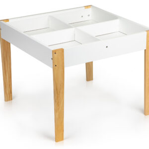 Pod blatem ukryty jest organizer, który pomoże utrzymać porządek i wyrobi nawyk sprzątania po skończonej zabawie. Do dyspozycji są 4 pojemne przegrody, które pomieszczą klocki, zabawki, przybory do rysowania, a nawet książki.