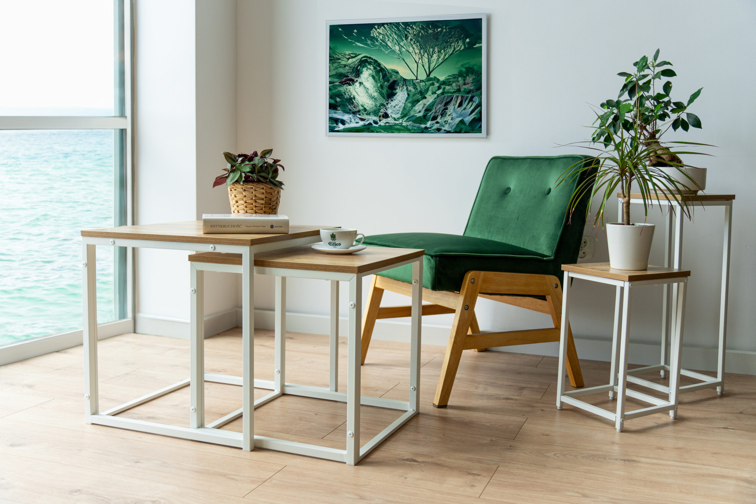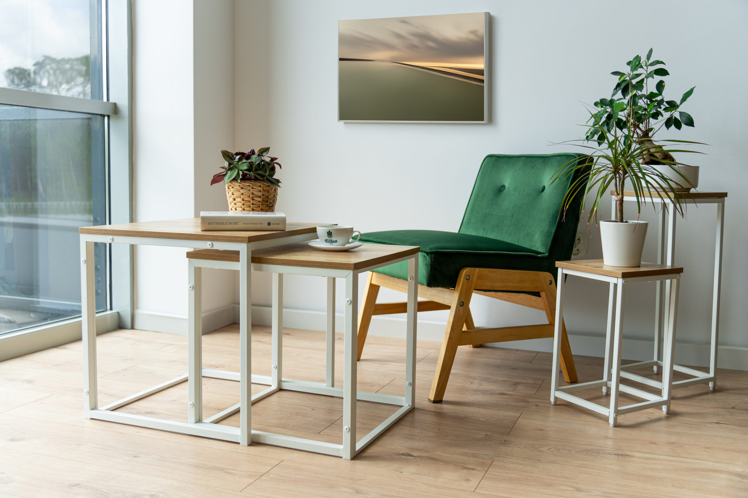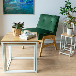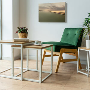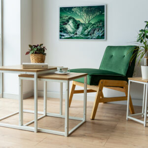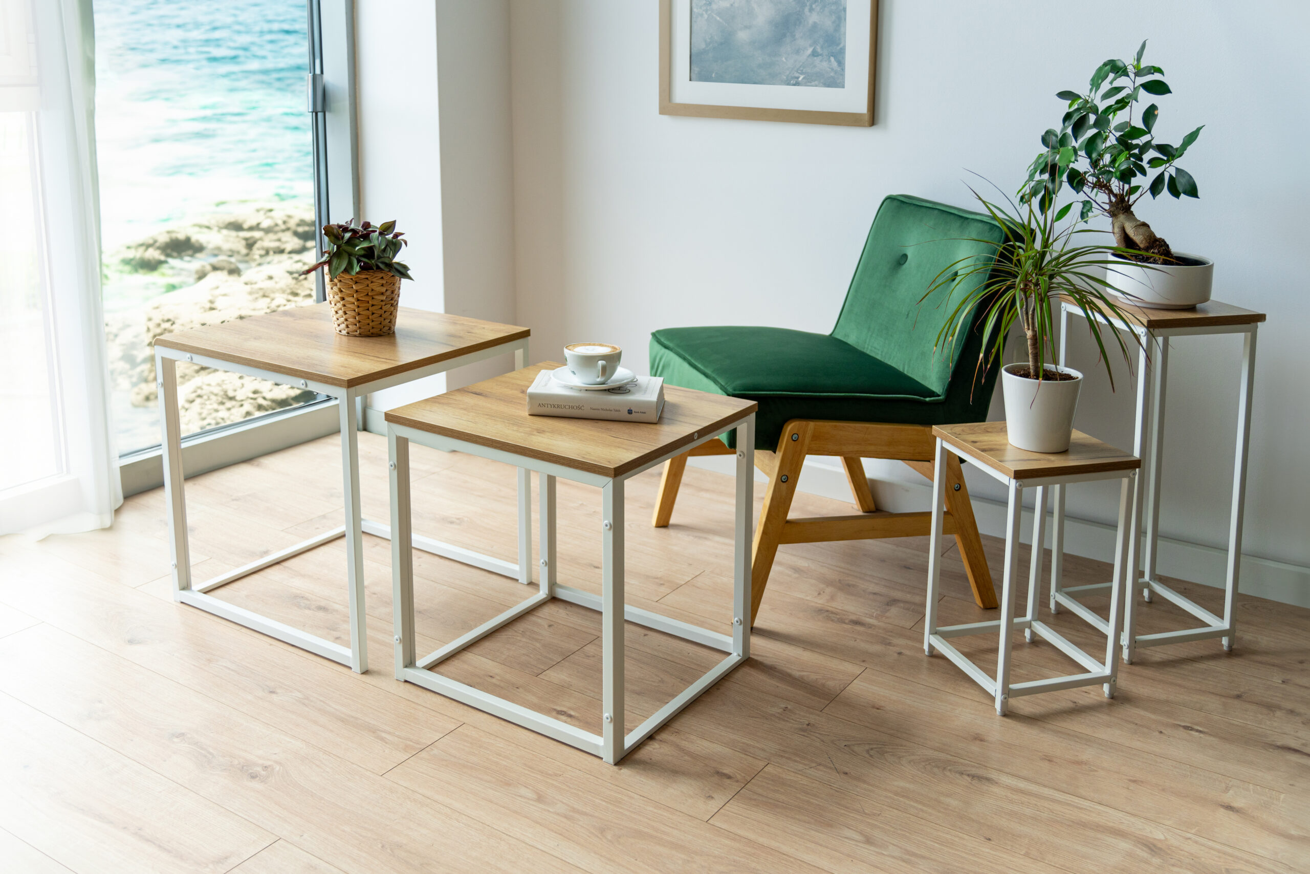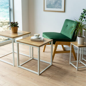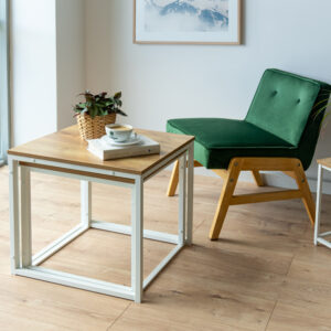 Nadaj swojemu domowi wyjątkowy industrialny akcent dzięki temu designerskiemu zestawowi Praven. Zestaw tworzą dwa eleganckie stoliki. Kwadratowa, metalowa rama w białym kolorze łączy się z blatem z płyty laminowanej w kolorze dębu craft, co stanowi harmonijny element dekoracyjny w salonie, korytarzu, biurze i nie tylko. Umieść doniczki, kubki, dekoracje lub czasopisma na stolikach, aby zawsze mieć je pod ręką.
