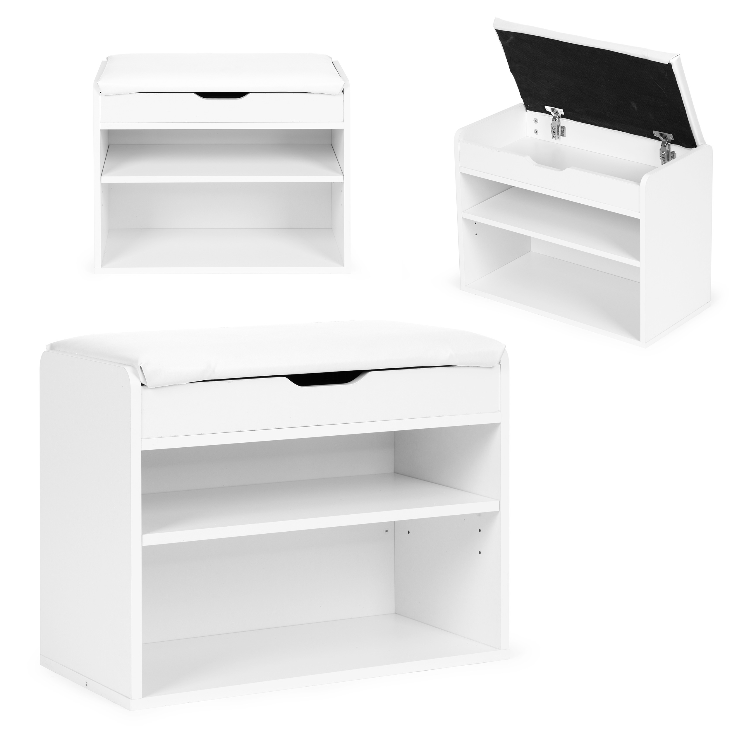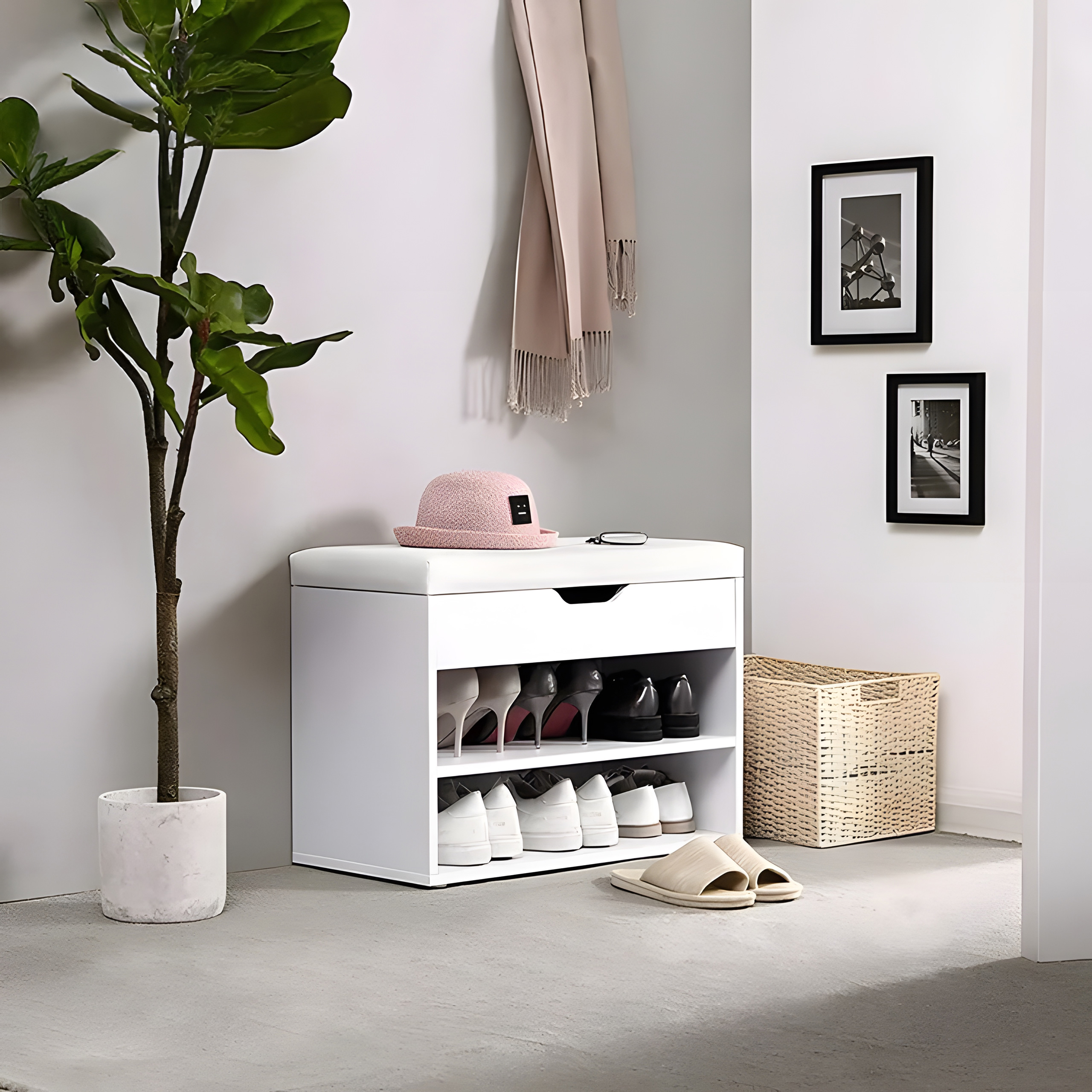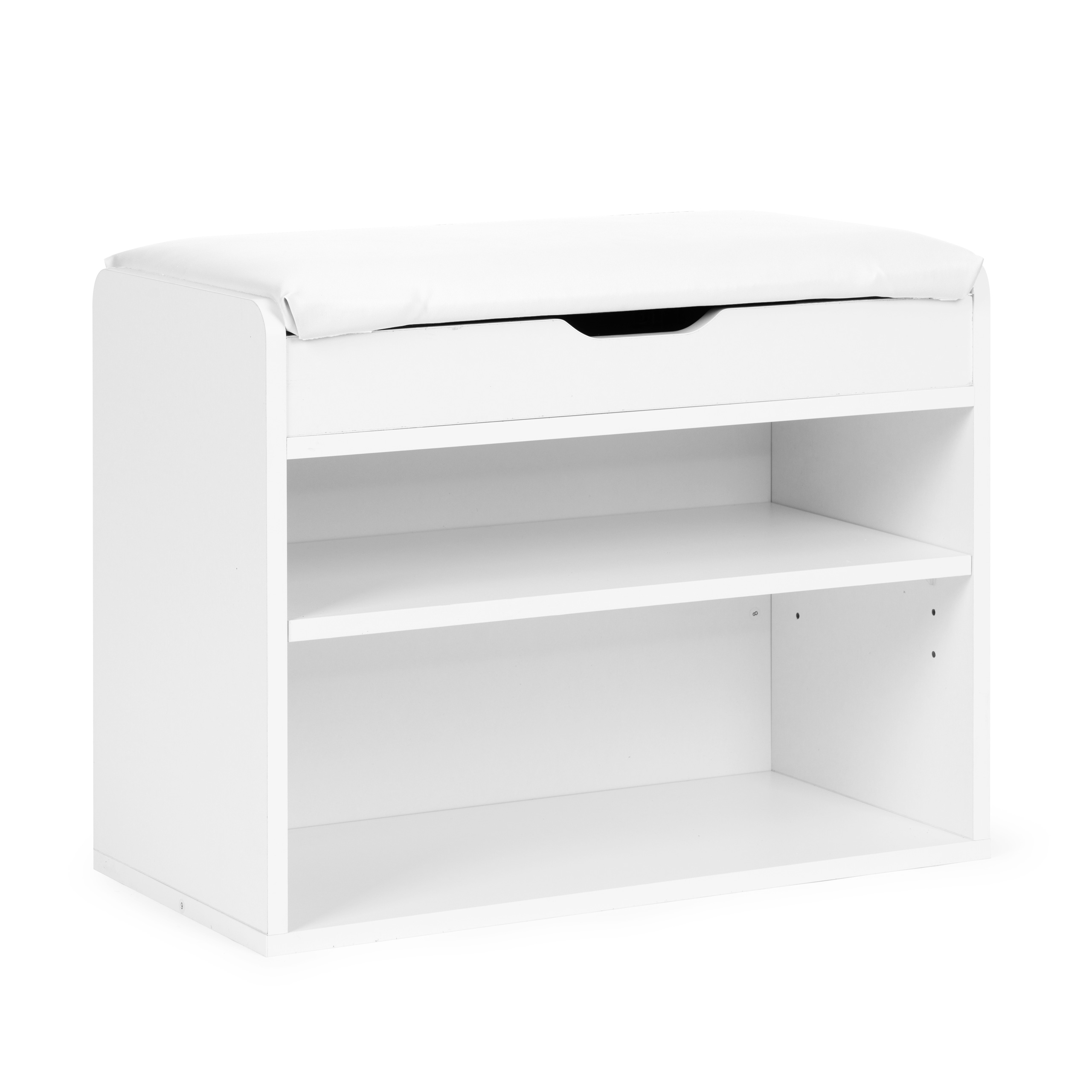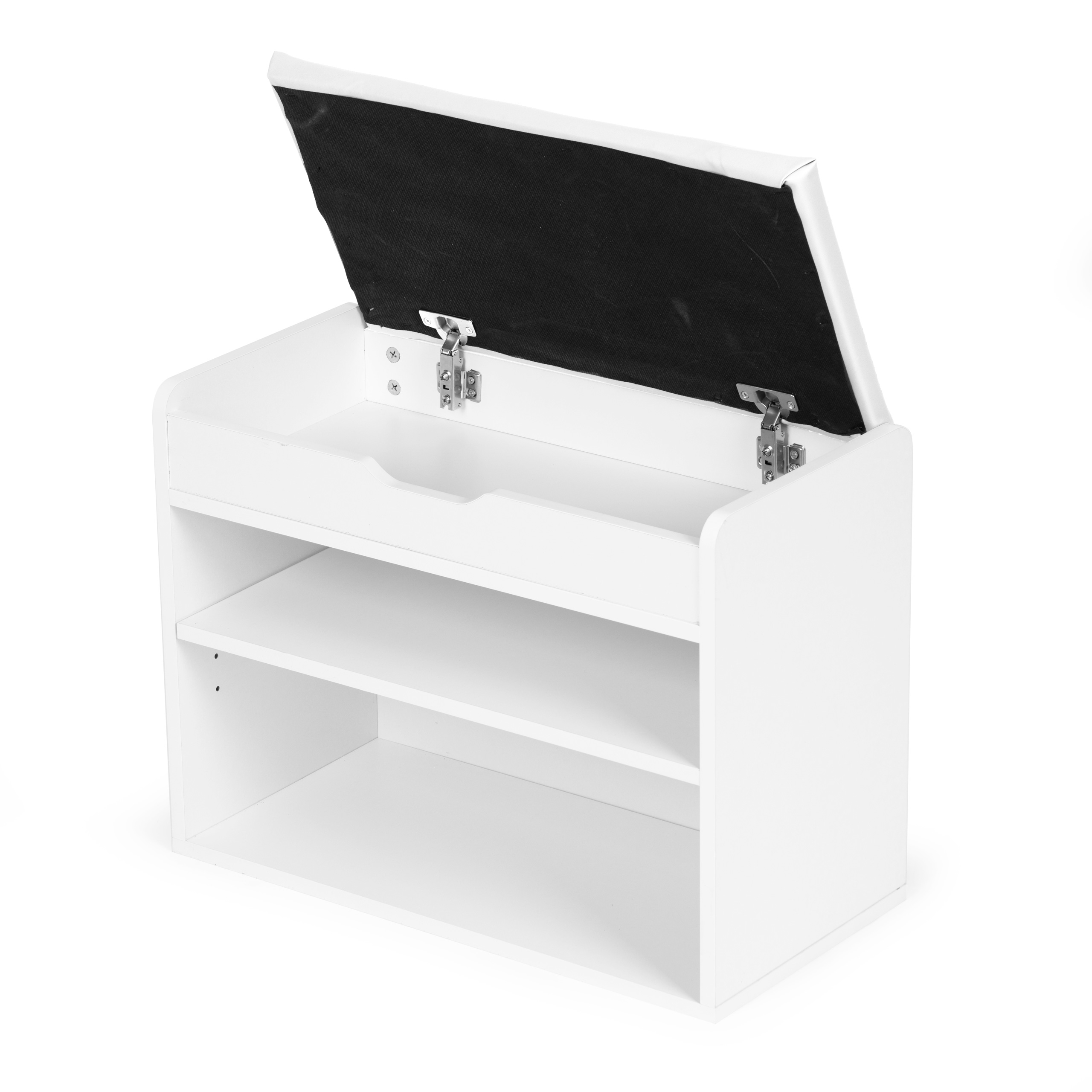 Pod siedziskiem znajduje się kolejna przestrzeń, idealna na schowanie kapci lub mniejszych elementów garderoby jak np. czapki, szale, czy rękawiczki.