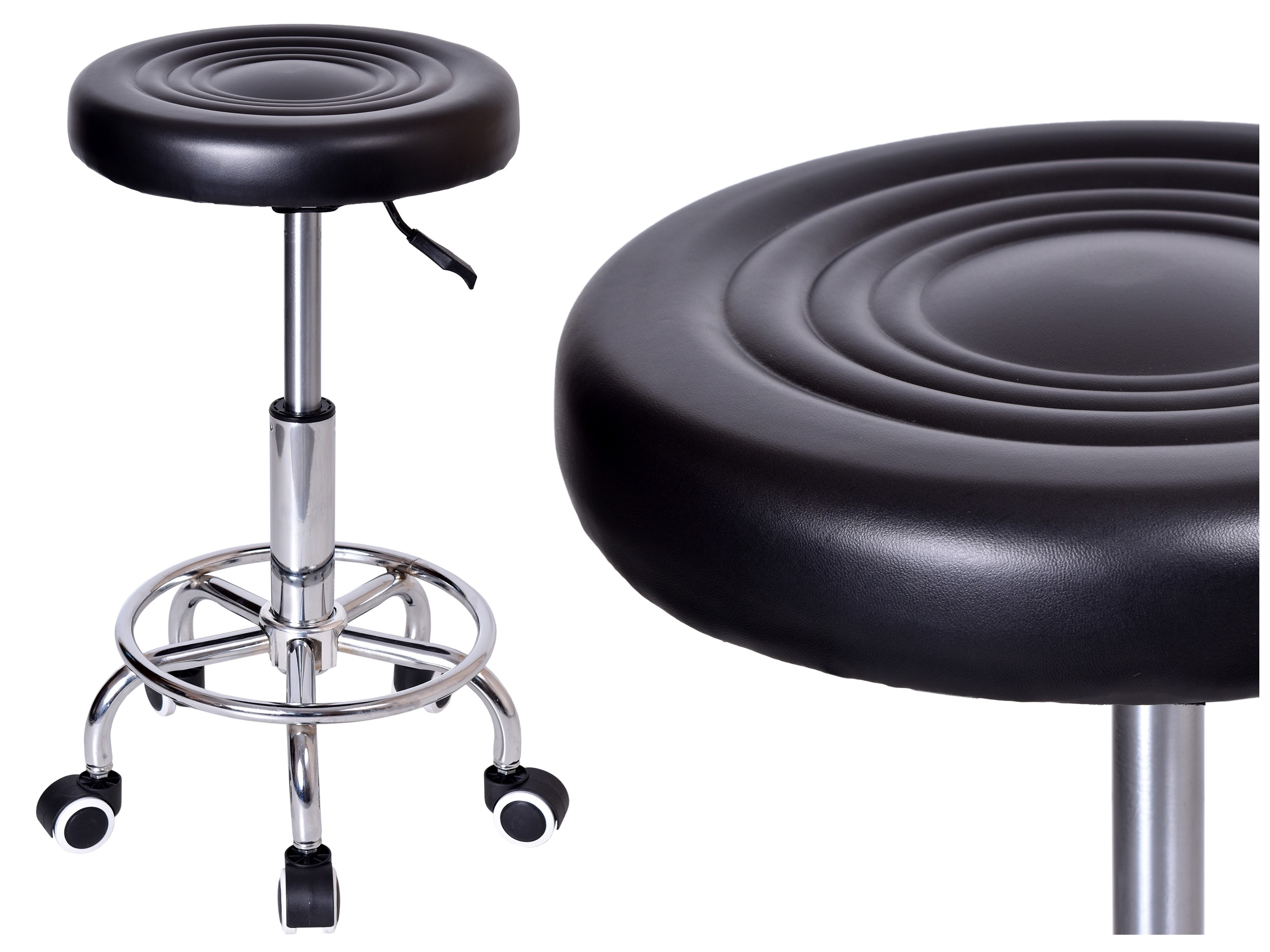 Taboret Monza to klasyczny stołek kosmetyczny i fryzjerski. Posiada wygodne tapicerowane siedzisko z ekoskóry z regulowaną wysokością oraz stabilną podstawę na gumowych kółkach. Dzięki temu łatwo go przemieszczać. Oryginalne połączenie klasycznego stołka z nowoczesnym designem. Świetnie nada się do nowoczesnych kuchni, restauracji, barów, ekskluzywnych sklepów, salonów kosmetycznych/fryzjerskich, eleganckich biur, stoisk na targach, punktów informacyjnych. Kupując u nas, kupujesz od bezpośredniego importera!