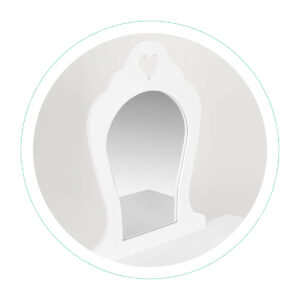 Głównym elementem toaletki jest duże, ozdobne lustro, które dodaje uroku oraz pozwala małej dziewczynce obserwować swoje stylizacje i zabawy. Lustro ma pięknie zaprojektowany kształt, aby nadać toaletce elegancki, a zarazem dziewczęcy wygląd.