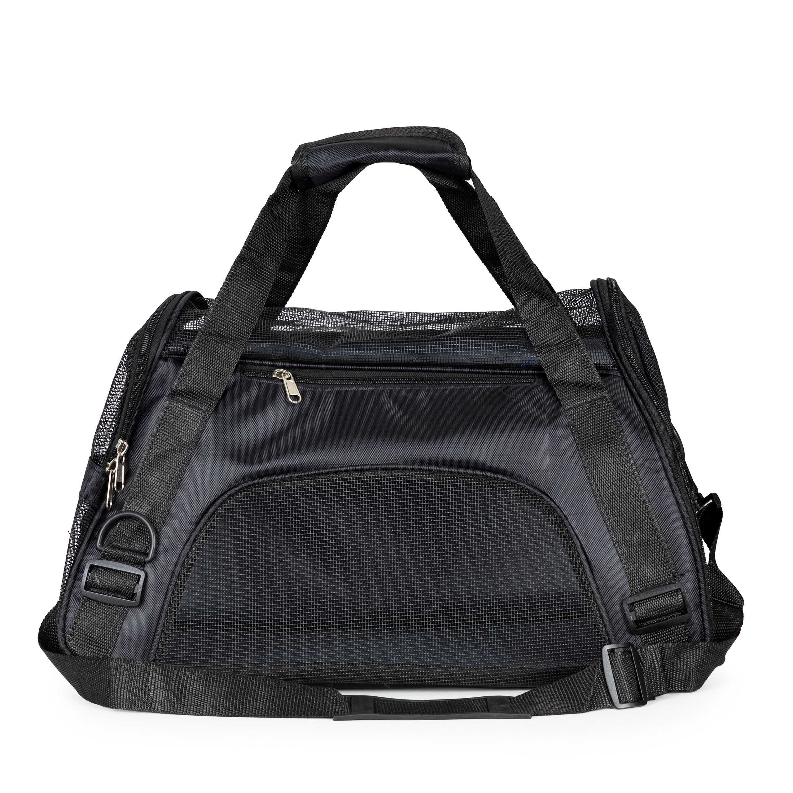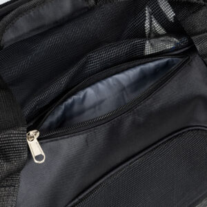 Transporter jest wyposażony w wentylację z siatki umieszczonej na jego bokach i górze, co zapewnia optymalną cyrkulację powietrza. Ta inteligentna konstrukcja pozwala zwierzęciu oddychać swobodnie i utrzymuje świeże powietrze wewnątrz transportera, zapewniając komfort w trakcie podróży.