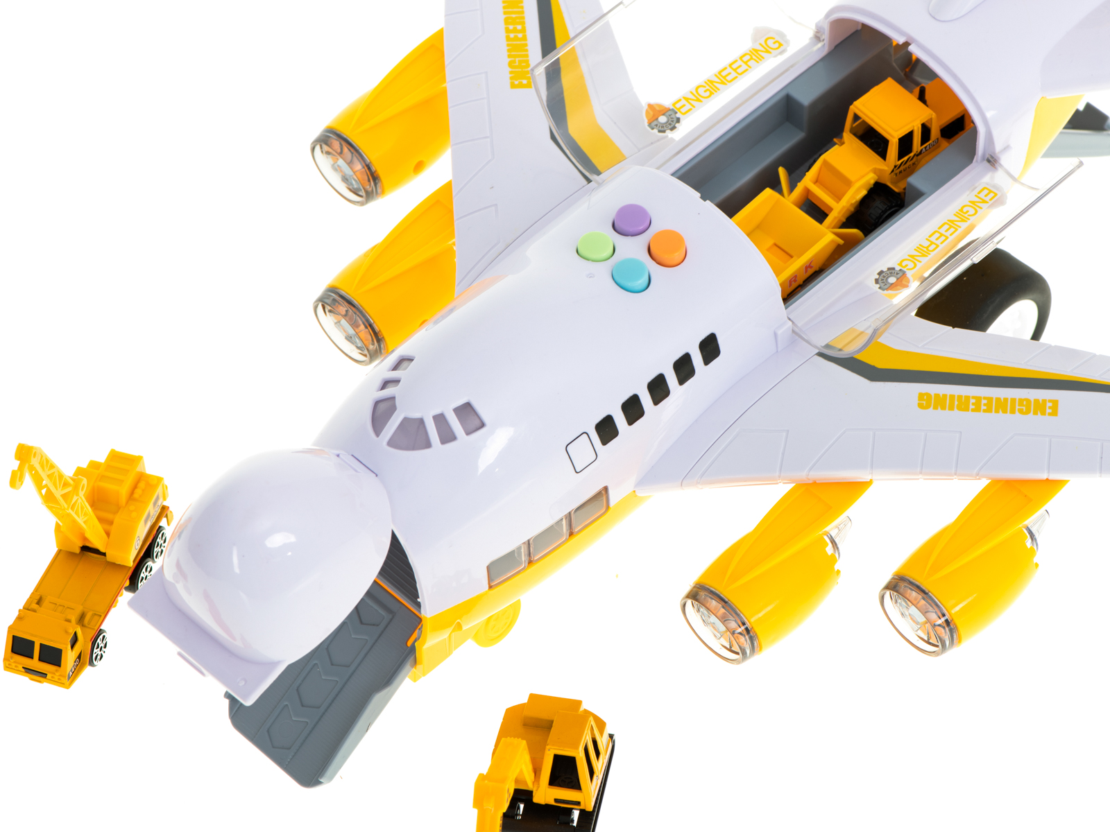 przetransportować dołączone do zestawu auta. Ma on również świecące diody LED