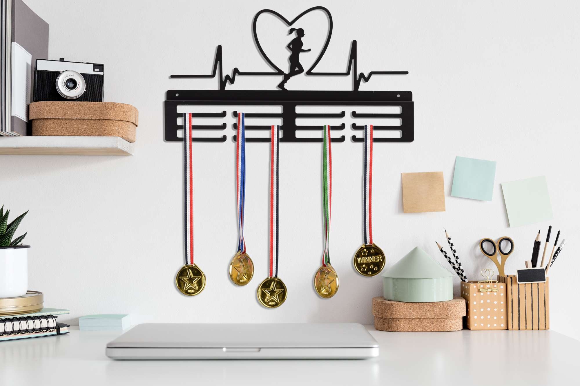 Doskonały pomysł na prezent. Wieszak na medale to najmodniejszy gadżet do pokoju zarówno dzieci jak i dorosłych! Bardzo estetycznie wykonany, literki wycinane sa bowiem laserowo. Metalową konstrukcję zabezpieczono proszkowo matowym lakierem w czarnym kolorze. Dwanaście uchwytów pomieści od sześćdziesięciu do stu medali.