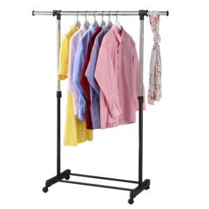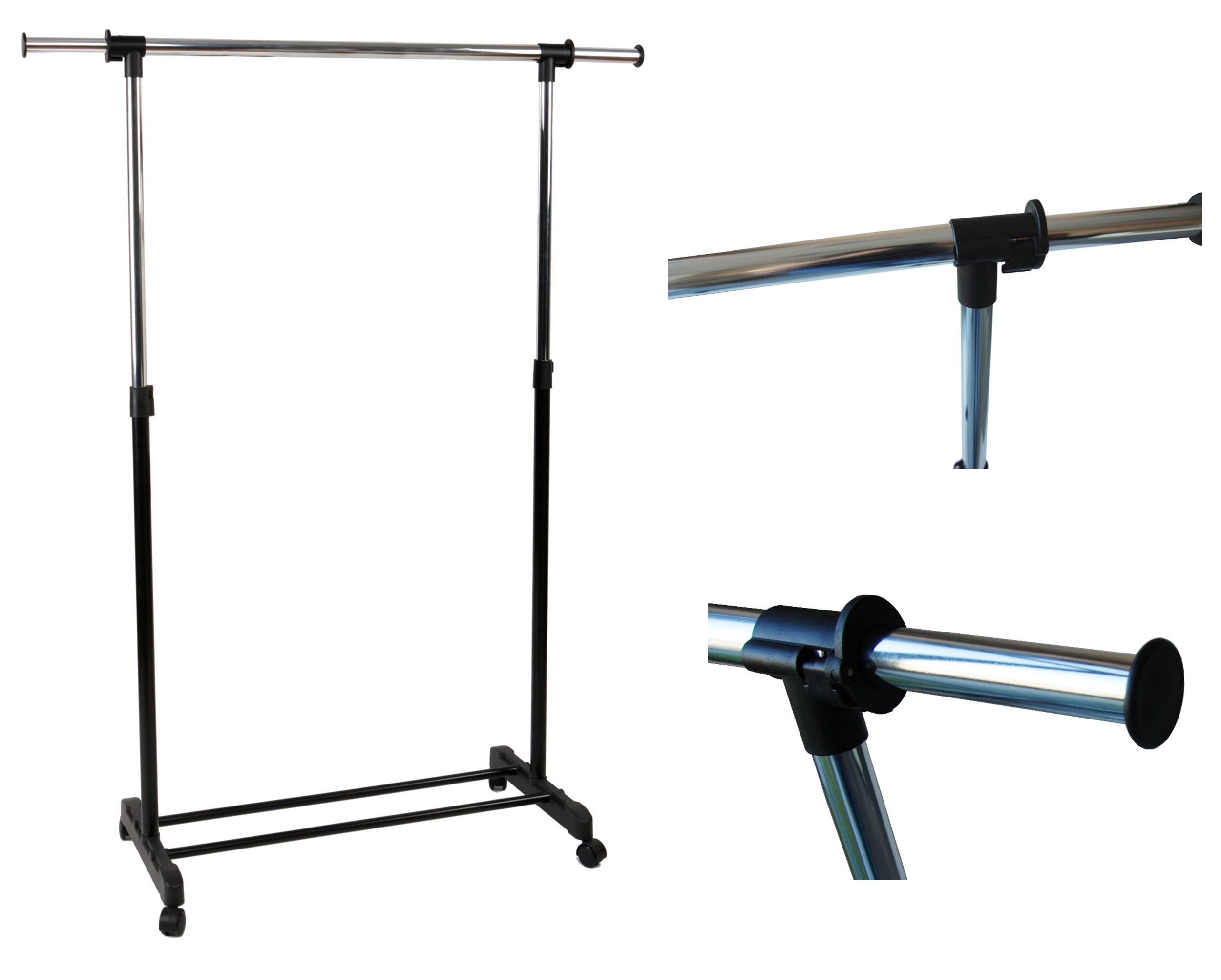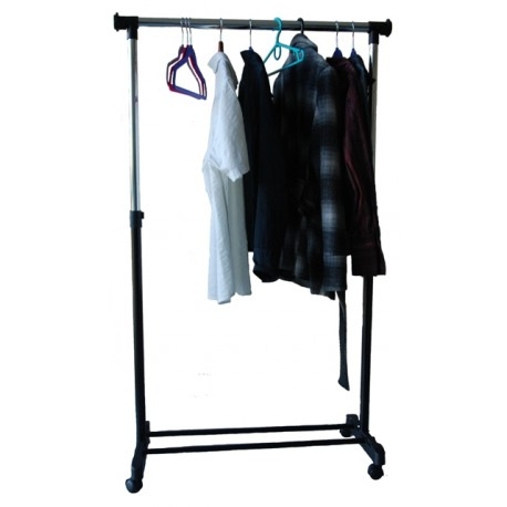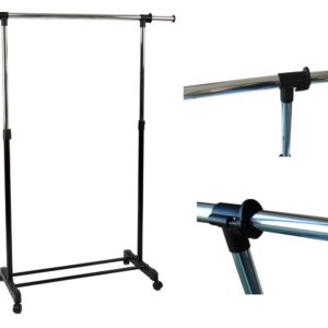 Na tej aukcji oferujemy praktyczny i wytrzymały wieszak garderobiany na kółkach. Wieszak sprawdzi się w każdym domu i w biurze, w którym brakuje miejsca do powieszenia odzieży. Nasz produkt został wyposażony w pojedynczy chromowany drążek z wyjątkowo grubych, chromowanych rurek. Dodatkowym atutem wieszaka jest wytrzymała i zaskakująco pojemna półka na buty, oraz nakładki na końce drążka uniemożliwiające zsunięcie się odzieży. Montaż wieszaka jest niezwykle prosty i nie wymaga użycia narzędzi. Posiada regulację wysokości i szerokości.