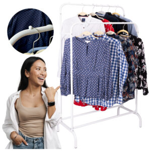 Wieszak stojący na ubrania BAGRUS to funkcjonalne i stylowe rozwiązanie, które pomoże utrzymać porządek w każdej garderobie. Wykonany z wysokiej jakości metalu w eleganckim matowym wykończeniu, cechuje się solidnością i trwałością. Dzięki podwójnym drążkom, wieszak zapewnia dużo miejsca na przechowywanie odzieży – doskonale sprawdzi się na płaszcze, marynarki, sukienki czy koszule.