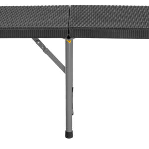 Składany stół cateringowy. Bardzo praktyczny i lekki. Konstrukcja wykonana ze stali malowanej proszkowo. Blat wykonany z polietylenu HDPE. Wzorowany na rattan. Odporny na promienie słoneczne. Dzięki unikalnemu projektowi całość konstrukcji chowa się w blat stołu, zajmując mało miejsca i tworząc ergonomiczną walizkę, łatwą do przenoszenia.