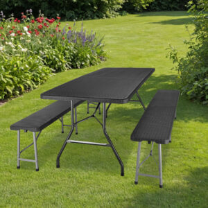 Zestaw cateringowy Rattan czarny stół 180 cm+ 2 ławki