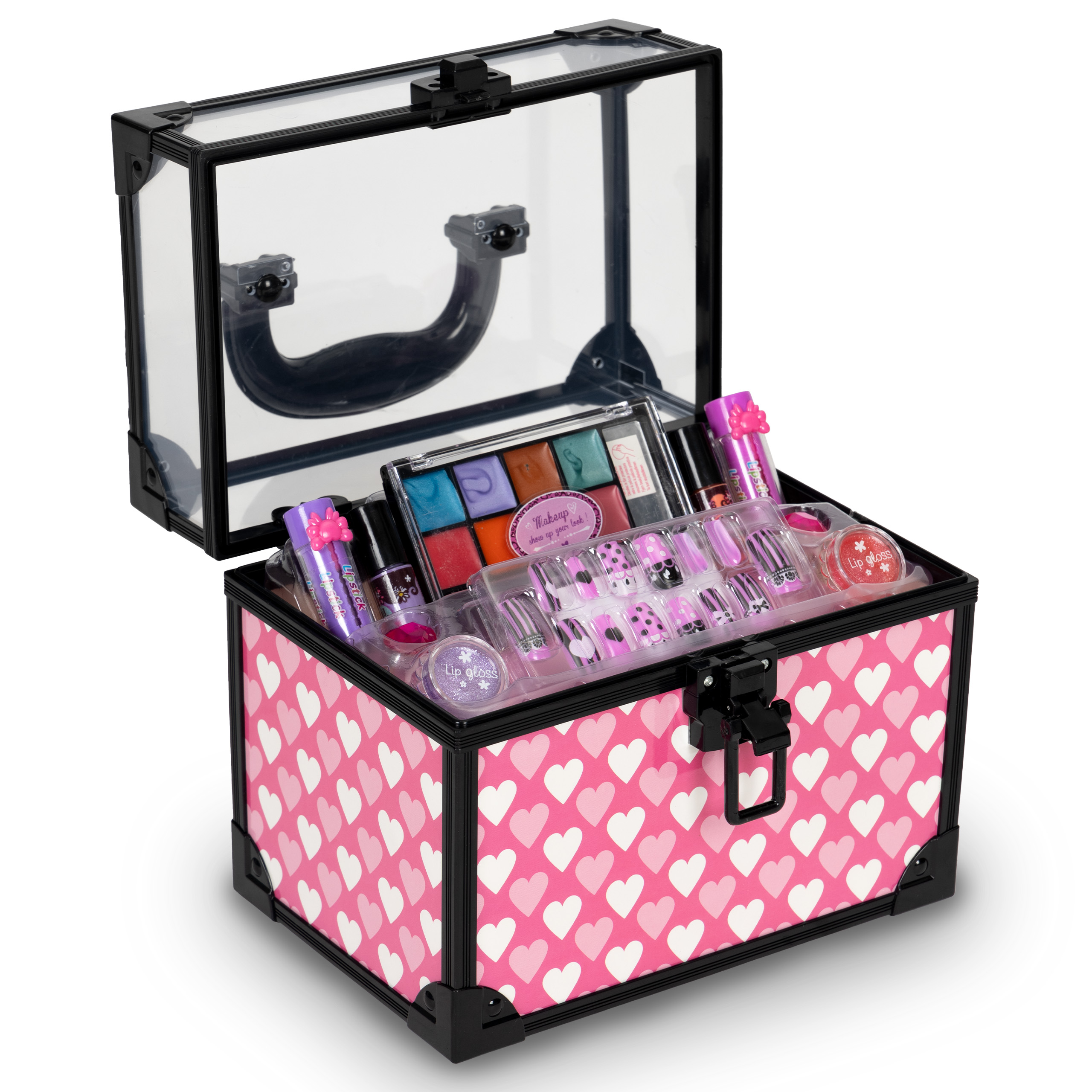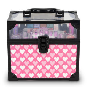 Kuferek pełen kosmetyków, błyszczyków, cieni, pomadek czy zabawkowych tipsów sprawi ze zabaw w domowe Spa nie będzie końca a precyzja wykonania idealnego makijażu nie sprawi większego problemu.