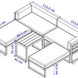 Zawartość zestawu: 2 sofy – lewa i prawa, 2 pufy, 1 stolik, 8 poduszek i pokrowców, zestaw łączenia modułów
